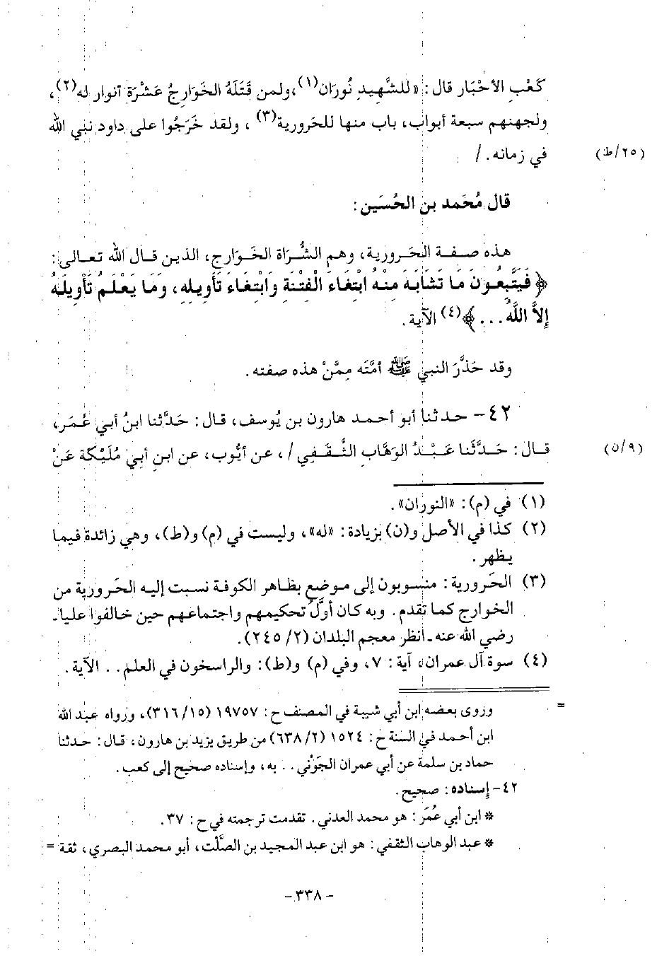 42 - حَدَّثَنَا أَبُو أَحْمَدَ هَارُونُ بْنُ يُوسُفَ قَالَ: حَدَّثَنَا ابْنُ أَبِي عُمَرَ قَالَ: حَدَّثَنَا عَبْدُ الْوَهَّابِ الثَّقَفِيُّ، عَنْ أَيُّوبَ، عَنِ ابْنِ أَبِي مُلَيْكَةَ، عَنْ -[339]- عَائِشَةَ رَضِيَ اللَّهُ عَنْهَا أَنَّ رَسُولَ اللَّهِ صَلَّى اللهُ عَلَيْهِ وَسَلَّمَ قَرَأَ: {§هُوَ الَّذِي أَنْزَلَ عَلَيْكَ الْكِتَابَ مِنْهُ آيَاتٌ مُحْكَمَاتٌ هُنَّ أُمُّ الْكِتَابِ وَأُخَرُ مُتَشَابِهَاتٌ} [آل عمران: 7] فَأَمَّا الَّذِينَ فِي قُلُوبِهِمْ زَيْغٌ فَيَتَّبِعُونَ مَا تَشَابَهَ مِنْهُ ابْتِغَاءَ الْفِتْنَةِ وَابْتِغَاءَ تَأْوِيلِهِ وَمَا يَعْلَمُ تَأْوِيلَهُ إِلَّا اللَّهُ الْآيَةَ، فَقَالَ: «إِذَا رَأَيْتُمُ الَّذِينَ يُجَادِلُونَ فِيهِ فَهُمُ الَّذِينَ عَنَى اللَّهُ تَعَالَى، فَاحْذَرُوهُمْ»
