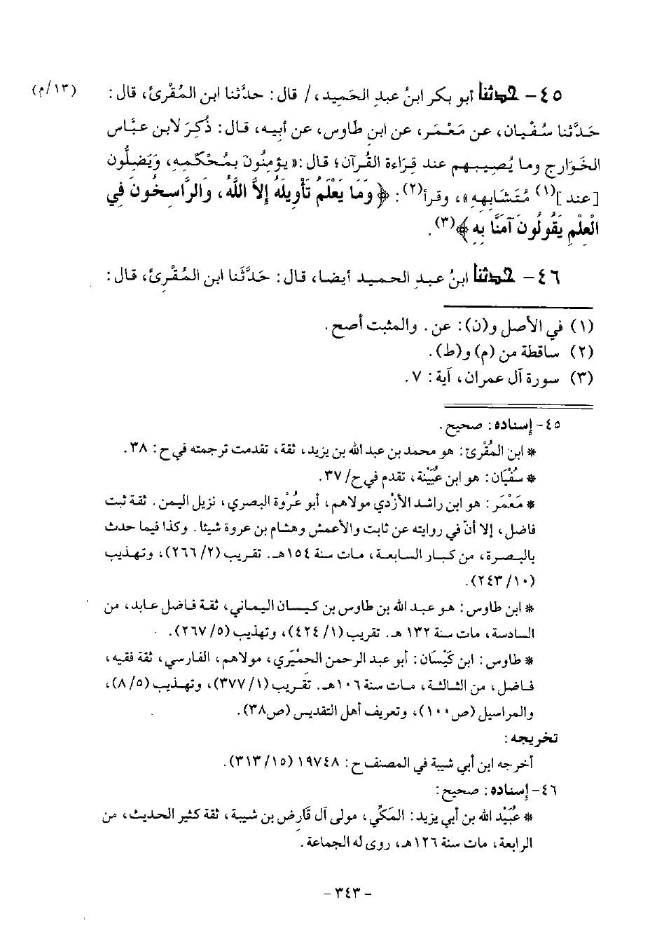 45 - وَحَدَّثَنَا أَبُو بَكْرِ بْنُ عَبْدِ الْحَمِيدِ قَالَ: حَدَّثَنَا ابْنُ الْمُقْرِئِ قَالَ: ثنا سُفْيَانُ، عَنْ مَعْمَرٍ، عَنِ ابْنِ طَاوُسٍ، عَنْ أَبِيهِ قَالَ: ذُكِرَ لِابْنِ عَبَّاسٍ الْخَوَارِجُ وَمَا يُصِيبُهُمْ عِنْدَ قِرَاءَةِ الْقُرْآنِ؟ قَالَ: " §يُؤْمِنُونَ بِمُحْكَمِهِ، وَيَضِلُّونَ عَنْ مُتَشَابِهِهِ وَقَرَأَ {وَمَا يَعْلَمُ تَأْوِيلَهُ إِلَّا اللَّهُ وَالرَّاسِخُونَ} [آل عمران: 7] فِي الْعِلْمِ يَقُولُونَ آمَنَّا بِهِ "