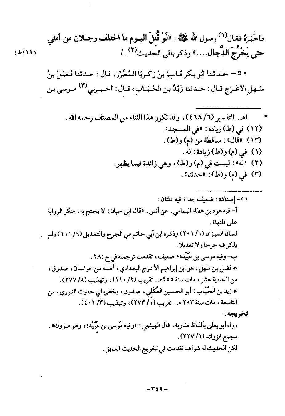 50 - حَدَّثَنَا أَبُو بَكْرٍ قَاسِمُ بْنُ زَكَرِيَّا الْمُطَرِّزُ قَالَ: حَدَّثَنَا فَضْلُ بْنُ سَهْلٍ الْأَعْرَجُ قَالَ: حَدَّثَنَا زَيْدُ بْنُ الْحُبَابِ قَالَ: أَخْبَرَنِي مُوسَى بْنُ -[350]- عُبَيْدَةَ قَالَ: حَدَّثَنِي هُودُ بْنُ عَطَاءٍ الْحَنَفِيُّ، عَنْ أَنَسِ بْنِ مَالِكٍ قَالَ: كَانَ فِينَا شَابٌّ ذُو عِبَادَةٍ وَزُهْدٍ، فَوَصَفْنَاهُ لِلنَّبِيِّ صَلَّى اللهُ عَلَيْهِ وَسَلَّمَ، وَسَمَّيْنَاهُ بِاسْمِهِ، فَلَمْ يَعْرِفْهُ، فَبَيْنَا نَحْنُ كَذَلِكَ إِذْ أَقْبَلَ، فَقُلْنَا: يَا رَسُولَ اللَّهِ هُوَ ذَا، فَقَالَ: «إِنِّي لَأَرَى §عَلَى وَجْهِهِ سَفْعَةً مِنَ الشَّيْطَانِ» فَجَاءَ فَسَلَّمَ عَلَى الْقَوْمِ، فَرَدُّوا السَّلَامَ، فَقَالَ لَهُ رَسُولُ اللَّهِ صَلَّى اللهُ عَلَيْهِ وَسَلَّمَ: أَجَعَلْتَ فِي نَفْسِكَ أَنْ لَيْسَ فِي الْقَوْمِ أَحَدٌ خَيْرٌ مِنْكَ؟ " قَالَ: نَعَمْ، ثُمَّ وَلَّى، فَدَخَلَ الْمَسْجِدَ، فَقَالَ رَسُولُ اللَّهِ صَلَّى اللهُ عَلَيْهِ وَسَلَّمَ: «مَنْ يَقْتُلُ الرَّجُلَ؟» فَقَالَ أَبُو بَكْرٍ: أَنَا يَا رَسُولَ اللَّهِ، فَدَخَلَ الْمَسْجِدَ، فَوَجَدَهُ يُصَلِّي فَقَالَ أَبُو بَكْرٍ: وَجَدْتُهُ يُصَلِّي، وَقَدْ نَهَيْتَنَا عَنْ ضَرْبِ الْمُصَلِّينَ، فَقَالَ " مَنْ يَقْتُلُ الرَّجُلَ؟ فَقَالَ عُمَرُ رَضِيَ اللَّهُ عَنْهُ: أَنَا يَا رَسُولَ اللَّهِ فَدَخَلَ الْمَسْجِدَ فَوَجَدَهُ سَاجِدًا، فَقَالَ: أَقْتُلُ رَجُلًا يُصَلِّي وَقَدْ نَهَانَا عَنْ ضَرْبِ الْمُصَلِّينَ " فَجَاءَ، فَقَالَ لَهُ النَّبِيُّ: «مَهْ يَا عُمَرُ» قَالَ وَجَدْتُهُ سَاجِدًا، وَقَدْ -[351]- نَهَيْتَنَا عَنْ ضَرْبِ الْمُصَلِّينَ، ثُمَّ قَالَ: «مَنْ يَقْتُلُ الرَّجُلَ؟» فَقَالَ عَلِيٌّ كَرَّمَ اللَّهُ وَجْهَهُ: أَنَا، فَقَالَ: «أَنْتَ تَقْتُلُهُ إِنْ وَجَدْتَهُ» ، فَذَهَبَ عَلِيٌّ فَجَاءَ فَقَالَ لَهُ النَّبِيُّ صَلَّى اللهُ عَلَيْهِ وَسَلَّمَ: «مَهْ يَا عَلِيُّ» قَالَ: وَجَدْتُهُ قَدْ خَرَجَ، فَقَالَ: «أَمَا إِنَّكَ لَوْ قَتَلْتَهُ لَكَانَ أَوَّلَهُمْ وَآخِرَهُمْ، وَمَا اخْتَلَفَ مِنْ أُمَّتِي اثْنَانِ»