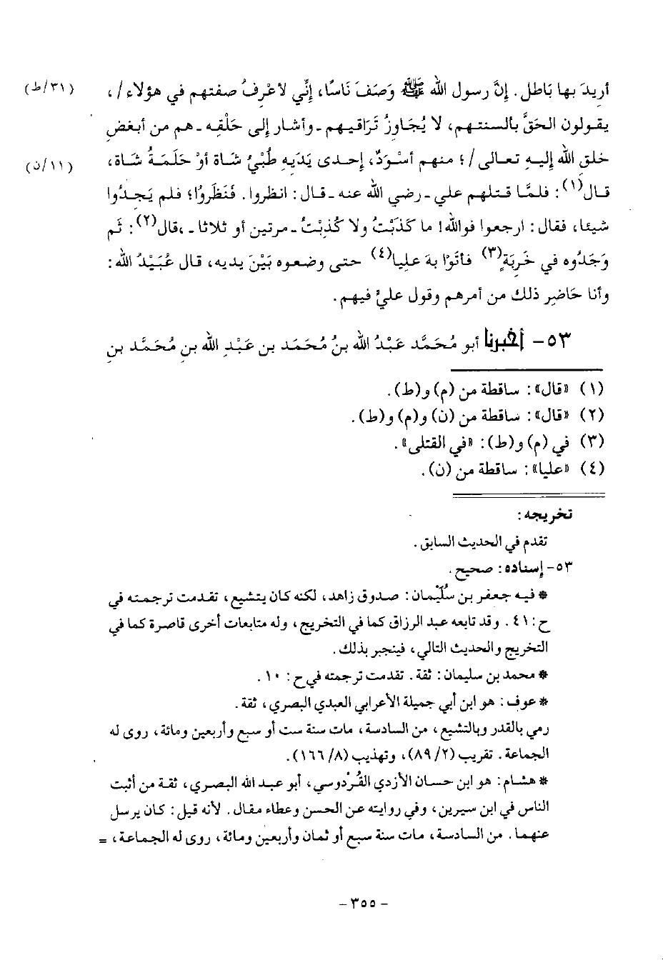 53 - أَخْبَرَنَا أَبُو مُحَمَّدٍ عَبْدُ اللَّهِ بْنُ مُحَمَّدِ بْنِ عَبْدِ اللَّهِ بْنِ مُحَمَّدِ بْنِ -[356]- نَاجِيَةَ قَالَ: حَدَّثَنَا مُحَمَّدُ بْنُ سُلَيْمَانَ لُوَيْنٌ قَالَ: ثنا جَعْفَرُ بْنُ سُلَيْمَانَ الضُّبَعِيُّ قَالَ: حَدَّثَنَا عَوْفٌ، وَهِشَامٌ، عَنِ ابْنِ سِيرِينَ، عَنْ عُبَيْدَةَ يَعْنِي السَّلْمَانِيَّ قَالَ: شَهِدْتُ مَعَ عَلِيِّ بْنِ أَبِي طَالِبٍ رَضِيَ اللَّهُ عَنْهُ النَّهَرَ، فَلَمَّا قُتِلَتِ الْخَوَارِجُ قَالَ عَلِيُّ بْنُ أَبِي طَالِبٍ رَضِيَ اللَّهُ عَنْهُ: إِنَّ فِيهِمْ رَجُلًا مُخْدَجَ الْيَدِ أَوْ مُودَنَ الْيَدِ، قَالَ: فَنَظَرُوا فَلَمْ يَقْدِرُوا عَلَيْهِ، فَقَالَ ذَلِكَ ثَلَاثًا ثُمَّ -[357]- قَالَ: انْظُرُوا وَقَلِّبُوا الْقَتْلَى، فَاسْتَخْرَجُوا رَجُلًا آدَمَ مُثَدَّنًا يَدُهُ الْيُمْنَى كَأَنَّهَا ثَدْيُ الْمَرْأَةِ، §فَلَمَّا رَآهُ اسْتَقْبَلَ الْقِبْلَةَ وَرَفَعَ يَدَيْهِ فَحَمِدَ اللَّهَ وَأَثْنَى عَلَيْهِ وَشَكَرَ اللَّهَ الَّذِي وَلَّاهُ قَتْلَهُمْ، وَالَّذِي أَكْرَمَهُ بِقِتَالِهِمْ، ثُمَّ أَقْبَلَ عَلَيْنَا بِوَجْهِهِ، فَقَالَ: لَوْلَا أَنْ تَبْطِرُوا لَحَدَّثْتُكُمْ بِمَا سَبَقَ عَلَى لِسَانِ النَّبِيِّ صَلَّى اللهُ عَلَيْهِ وَسَلَّمَ مِنَ الْكَرَامَةِ لِمَنْ قَاتَلَ هَؤُلَاءِ الْقَوْمَ قَالَ عُبَيْدَةُ: فَقُلْتُ: يَا أَمِيرَ الْمُؤْمِنِينَ، أَشَيْءٌ بَلَغَكَ عَنِ النَّبِيِّ صَلَّى اللهُ عَلَيْهِ وَسَلَّمَ أَوْ شَيْءٌ سَمِعْتَهُ مِنْهُ؟ قَالَ: بَلْ شَيْءٌ سَمِعْتُهُ مِنْهُ وَرَبِّ الْكَعْبَةِ