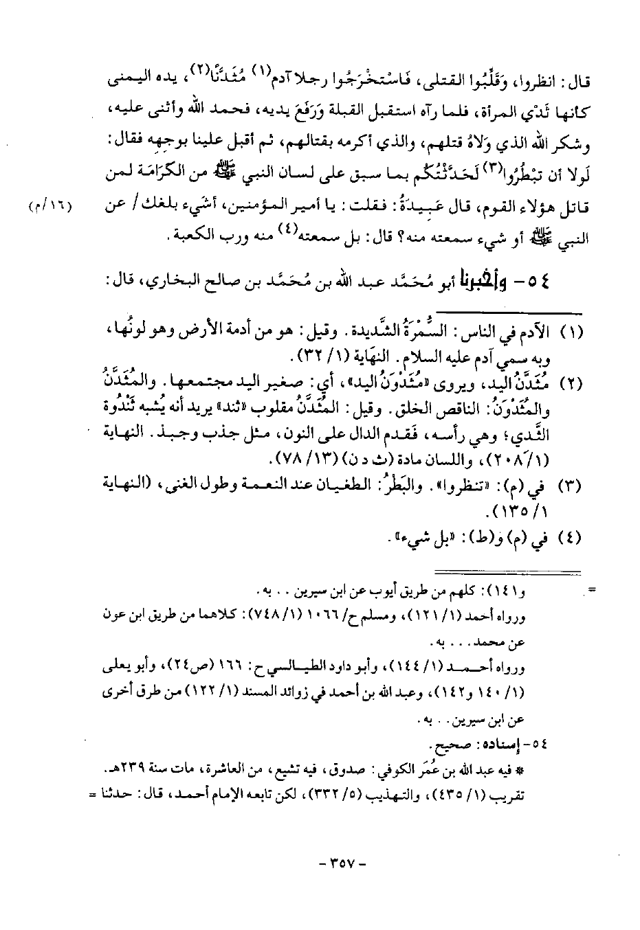 54 - وَأَخْبَرَنَا أَبُو مُحَمَّدٍ عَبْدُ اللَّهِ بْنُ مُحَمَّدِ بْنِ صَالِحٍ الْبُخَارِيُّ قَالَ -[358]-: حَدَّثَنَا عَبْدُ اللَّهِ بْنُ عُمَرَ الْكُوفِيُّ قَالَ: حَدَّثَنَا وَكِيعٌ، عَنْ جَرِيرِ بْنِ حَازِمٍ، وَأَبِي عَمْرِو بْنِ الْعَلَاءِ النَّحْوِيِّ، عَنِ ابْنِ سِيرِينَ، عَنْ عَبِيدَةَ السَّلْمَانِيِّ، عَنْ عَلِيٍّ رَضِيَ اللَّهُ عَنْهُ قَالَ: قَالَ رَسُولُ اللَّهِ صَلَّى اللهُ عَلَيْهِ وَسَلَّمَ: " §سَيَخْرُجُ قَوْمٌ فِيهِمْ رَجُلٌ مُودَنُ الْيَدِ، أَوْ مُثَدْوَنُ الْيَدِ، أَوْ مُخَدَّجُ الْيَدِ، وَلَوْلَا أَنْ تَبْطِرُوا لَأَنْبَأْتُكُمْ مَا وَعَدَ اللَّهُ تَعَالَى الَّذِينَ يَقْتُلُونَهُمْ عَلَى لِسَانِ نَبِيِّهِ صَلَّى اللهُ عَلَيْهِ وَسَلَّمَ قَالَ عُبَيْدَةُ: فَقُلْتُ لِعَلِيٍّ رَضِيَ اللَّهُ عَنْهُ: أَنْتَ سَمِعْتَهُ مِنْ رَسُولِ اللَّهِ صَلَّى اللهُ عَلَيْهِ وَسَلَّمَ؟ قَالَ: نَعَمْ، سَمِعْتُهُ وَرَبِّ الْكَعْبَةِ، سَمِعْتُهُ إِي وَرَبِّ الْكَعْبَةِ، سَمِعْتُهُ إِي وَرَبِّ الْكَعْبَةِ سَمِعْتُهُ