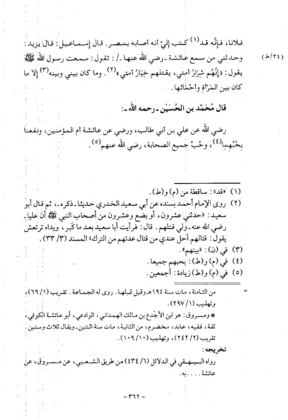 قَالَ إِسْمَاعِيلُ: قَالَ يَزِيدُ: وَحَدَّثَنِي مَنْ، سَمِعَ عَائِشَةَ رَضِيَ اللَّهُ عَنْهَا تَقُولُ: سَمِعْتُ رَسُولَ اللَّهِ صَلَّى اللهُ عَلَيْهِ وَسَلَّمَ يَقُولُ: «§إِنَّهُمْ شِرَارُ أُمَّتِي يَقْتُلُهُمْ خِيَارُ أُمَّتِي» قَالَتْ: وَمَا كَانَ بَيْنِي وَبَيْنَهُمْ إِلَّا مَا كَانَ بَيْنَ الْمَرْأَةِ وَأَحْمَائِهَا قَالَ مُحَمَّدُ بْنُ الْحُسَيْنِ رَحِمَهُ اللَّهُ: رَضِيَ اللَّهُ عَنْ عَلِيِّ بْنِ أَبِي طَالِبٍ وَرَضِيَ عَنْ عَائِشَةَ أُمِّ الْمُؤْمِنِينَ، وَنَفَعَنَا بِحُبِّهِمَا، وَحُبِّ جَمِيعِ الصَّحَابَةِ رَضِيَ اللَّهُ عَنْهُمْ