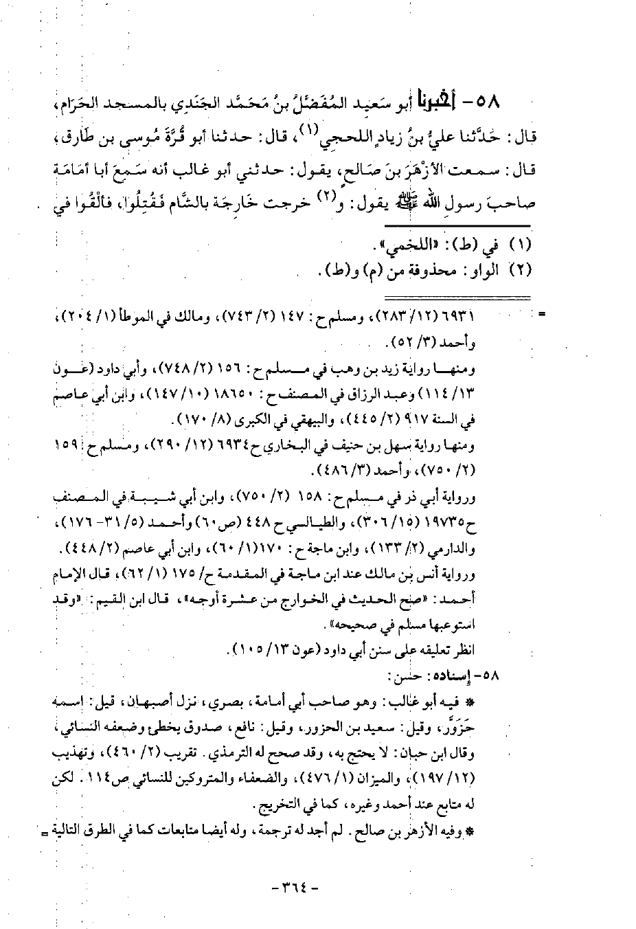 58 - أَخْبَرَنَا أَبُو سَعِيدٍ الْمُفَضَّلُ بْنُ مُحَمَّدٍ الْجَنَدِيُّ، بِالْمَسْجِدِ الْحَرَامِ قَالَ: حَدَّثَنَا عَلِيُّ بْنُ زِيَادٍ اللَّحْجِيُّ قَالَ: حَدَّثَنَا أَبُو قُرَّةَ مُوسَى بْنُ طَارِقٍ قَالَ: سَمِعْتُ الْأَزْهَرَ بْنَ صَالِحٍ يَقُولُ: حَدَّثَنِي أَبُو غَالِبٍ أَنَّهُ سَمِعَ أَبَا أُمَامَةَ صَاحِبَ رَسُولِ اللَّهِ صَلَّى اللهُ عَلَيْهِ وَسَلَّمَ يَقُولُ: خَرَجَتْ خَارِجَةٌ بِالشَّامِ فَقُتِلُوا، وَأُلْقُوا -[365]- فِي جُبٍّ، أَوْ بِئْرٍ قَالَ: فَأَقْبَلَ أَبُو أُمَامَةَ وَأَنَا مَعَهُ، حَتَّى وَقَفَ عَلَيْهِمْ، ثُمَّ بَكَى، ثُمَّ قَالَ: سُبْحَانَ اللَّهِ، مَا فَعَلَ الشَّيْطَانُ بِهَذِهِ الْأُمَّةِ؟ كِلَابُ النَّارِ، كِلَابُ النَّارِ، ثَلَاثًا، شَرُّ قَتْلَى تَحْتَ ظِلِّ السَّمَاءِ، شَرُّ قَتْلَى تَحْتَ ظِلِّ السَّمَاءِ، خَيْرُ قَتْلَى تَحْتَ ظِلِّ السَّمَاءِ، خَيْرُ قَتْلَى تَحْتَ ظِلِّ السَّمَاءِ، خَيْرُ قَتْلَى تَحْتَ ظِلِّ السَّمَاءِ مَنْ قَتَلُوهُ قَالَ: قُلْتُ يَا أَبَا أُمَامَةَ، أَشَيْءٌ تَقُولُهُ بِرَأْيِكَ، أَمْ -[366]- شَيْءٌ سَمِعْتَهُ مِنْ رَسُولِ اللَّهِ صَلَّى اللهُ عَلَيْهِ وَسَلَّمَ؟ قَالَ: إِنِّي إِذَنْ لَجَرِيءٌ، إِنِّي إِذَنْ لَجَرِيءٌ، ثَلَاثًا، بَلْ سَمِعْتُهُ مِنْ رَسُولِ اللَّهِ صَلَّى اللهُ عَلَيْهِ وَسَلَّمَ غَيْرَ مَرَّةٍ، وَلَا مَرَّتَيْنٍ، وَلَا ثَلَاثًا، حَتَّى عَدَّ عَشْرًا، سَمِعْتُ مِنْ رَسُولِ اللَّهِ يَقُولُ: «§سَيَأْتِي قَوْمٌ يَقْرَءُونَ الْقُرْآنَ لَا يُجَاوِزُ تَرَاقِيَهُمْ، أَوْ لَا يَعْدُو تَرَاقِيَهُمْ، يَمْرُقُونَ مِنَ الْإِسْلَامِ، كَمَا يَمْرُقُ السَّهْمُ مِنَ الرَّمِيَّةِ، لَا يَعُودُونَ فِي الْإِسْلَامِ حَتَّى يَعُودَ السَّهْمُ عَلَى فَوْقِهِ، طُوبَى لِمَنْ قَتَلُوهُ أَوْ قَتَلَهُمْ»