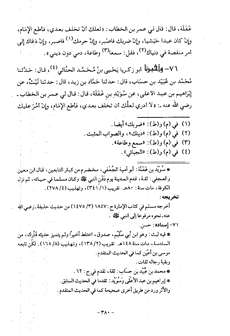 71 - بْنُ مُحَمَّدٍ الْحِنَّائِيُّ قَالَ: حَدَّثَنَا مُحَمَّدُ بْنُ عُبَيْدِ بْنِ حَسَّابٍ قَالَ: حَدَّثَنَا حَمَّادُ بْنُ زَيْدٍ قَالَ: حَدَّثَنَا لَيْثٌ، عَنْ إِبْرَاهِيمَ بْنِ عَبْدِ الْأَعْلَى، عَنْ سُوَيْدِ بْنِ غَفَلَةَ قَالَ: قَالَ لِي عُمَرُ بْنُ الْخَطَّابِ رَضِيَ اللَّهُ عَنْهُ: " لَا أَدْرِي §لَعَلَّكَ أَنْ تُخَلَّفَ بَعْدِي فَأَطِعِ الْإِمَامَ، وَإِنْ أُمِّرَ عَلَيْكَ -[381]- عَبْدٌ حَبَشِيٌّ مُجَدَّعٌ، وَإِنْ ظَلَمَكَ فَاصْبِرْ، وَإِنْ حَرَمَكَ فَاصْبِرْ، وَإِنْ دَعَاكَ إِلَى أَمْرٍ يَنْقُصُكَ فِي دُنْيَاكَ فَقُلْ: سَمْعًا وَطَاعَةً، دَمِي دُونَ دِينِي " قَالَ مُحَمَّدُ بْنُ الْحُسَيْنِ: فَإِنْ قَالَ قَائِلٌ: إِيشِ الَّذِي يَحْتَمِلُ عِنْدَكَ قَوْلُ عُمَرَ رَضِيَ اللَّهُ عَنْهُ فِيمَا قَالَهُ؟ قِيلَ لَهُ: يَحْتَمِلُ وَاللَّهُ أَعْلَمُ أَنْ نَقُولَ: مَنْ أُمِّرَ عَلَيْكَ مِنْ عَرَبِيٍّ أَوْ غَيْرِهِ أَسْوَدَ أَوْ أَبْيَضَ أَوْ عَجَمِيٍّ فَأَطِعْهُ فِيمَا لَيْسَ لِلَّهِ فِيهِ مَعْصِيَةٌ، وَإِنْ حَرَمَكَ حَقًّا لَكَ، أَوْ ضَرَبَكَ ظُلْمًا لَكَ، أَوِ انْتَهَكَ عِرْضَكَ، أَوْ أَخَذَ مَالَكَ، فَلَا يَحْمِلُكَ ذَلِكَ عَلَى أَنْ تَخْرُجَ عَلَيْهِ بِسَيْفِكَ حَتَّى تُقَاتِلَهُ، وَلَا تَخْرُجْ مَعَ -[382]- خَارِجِيٍّ يُقَاتِلُهُ، وَلَا تُحَرِّضْ غَيْرَكَ عَلَى الْخُرُوجِ عَلَيْهِ، وَلَكِنِ اصْبِرْ عَلَيْهِ وَقَدْ يَحْتَمِلُ أَنْ يَدْعُوَكَ إِلَى مَنْقَصَةٍ فِي دِينِكَ مِنْ غَيْرِ هَذِهِ الْجِهَةِ يَحْتَمِلُ أَنْ يَأْمُرَكَ بِقَتْلِ مَنْ لَا يَسْتَحِقُّ الْقَتْلَ، أَوْ بِقَطْعِ عُضْوِ مَنْ لَا يَسْتَحِقُّ ذَلِكَ، أَوْ بِضَرْبِ مَنْ لَا يَحِلُّ ضَرْبُهُ، أَوْ بِأَخْذِ مَالِ مَنْ لَا يَسْتَحِقُّ أَنْ تَأْخُذَ مَالَهُ، أَوْ بِظُلْمِ مَنْ لَا يَحِلُّ لَهُ وَلَا لَكَ ظُلْمُهُ، فَلَا يَسَعُكَ أَنْ تُطِيعَهُ، فَإِنْ قَالَ لَكَ: لَئِنْ لَمْ تَفْعَلْ مَا آمُرُكَ بِهِ وَإِلَّا قَتَلْتُكَ أَوْ ضَرَبْتُكَ، فَقُلْ: دَمِي دُونَ دِينِي؛ لِقَوْلِ النَّبِيِّ صَلَّى اللهُ عَلَيْهِ وَسَلَّمَ «لَا طَاعَةَ لِمَخْلُوقٍ فِي مَعْصِيَةِ الْخَالِقِ عَزَّ وَجَلَّ» وَلِقَوْلِهِ صَلَّى اللهُ عَلَيْهِ وَسَلَّمَ «إِنَّمَا الطَّاعَةُ فِي الْمَعْرُوفِ»