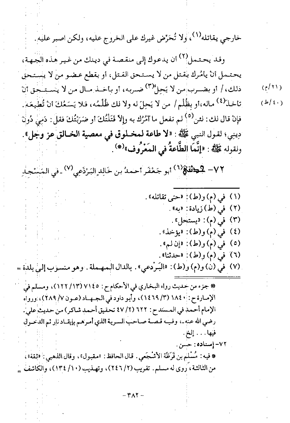 72 - حَدَّثَنَا أَبُو جَعْفَرٍ أَحْمَدُ بْنُ خَالِدٍ الْبَرْدَعِيُّ فِي الْمَسْجِدِ -[383]- الْحَرَامِ سَنَةَ تِسْعٍ وَسَبْعِينَ وَمِائَتَيْنِ قَالَ: حَدَّثَنَا عَلِيُّ بْنُ سَهْلٍ الرَّمْلِيُّ قَالَ: حَدَّثَنَا الْوَلِيدُ بْنُ مُسْلِمٍ عَنِ ابْنِ جَابِرٍ، قَالَ: حَدَّثَنِي رُزَيْقٌ مَوْلَى بَنِي فَزَارَةَ قَالَ: سَمِعْتُ مُسْلِمَ بْنَ قَرَظَةَ الْأَشْجَعِيَّ، يَقُولُ: سَمِعْتُ عَمِّي عَوْفَ بْنَ مَالِكٍ الْأَشْجَعِيَّ يَقُولُ: سَمِعْتُ رَسُولَ اللَّهِ صَلَّى اللهُ عَلَيْهِ وَسَلَّمَ يَقُولُ: «§خِيَارُ أَئِمَّتِكُمُ الَّذِينَ تُحِبُّونَهُمْ وَيُحِبُّونَكُمْ، وَتُصَلُّونَ عَلَيْهِمْ وَيُصَلُّونَ عَلَيْكُمْ، وَشِرَارُ أَئِمَّتِكُمُ -[384]- الَّذِينَ تُبْغِضُونَهُمْ وَيُبْغِضُونَكُمْ، وَتَلْعَنُونَهُمْ وَيَلْعَنُونَكُمْ» قُلْنَا: يَا رَسُولَ اللَّهِ: أَفَلَا نُنَابِذُهُمْ عَلَى ذَلِكَ؟ قَالَ: لَا، مَا أَقَامُوا فِيكُمُ الصَّلَاةَ، لَا مَا أَقَامُوا فِيكُمُ الصَّلَاةَ، أَلَا مَنْ وَلِيَ عَلَيْكُمْ مِنْهُمْ، فَرَآهُ يَأْتِي شَيْئًا مِنْ مَعْصِيَةِ اللَّهِ عَزَّ وَجَلَّ، فَلْيُنْكِرْ مَا يَأْتِي بِهِ مِنْ مَعْصِيَةِ اللَّهِ، وَلَا تَنْزِعَنَّ يَدًا مِنْ طَاعَةِ اللَّهِ عَزَّ وَجَلَّ " قُلْتُ لِرُزَيْقٍ: اللَّهَ، يَا أَبَا الْمِقْدَامِ لَسَمِعْتَ مُسْلِمَ بْنَ قَرَظَةَ، يَقُولُ: سَمِعْتُ عَمِّي عَوْفَ بْنَ مَالِكٍ، يَقُولُ: سَمِعْتُ رَسُولَ اللَّهِ صَلَّى اللهُ عَلَيْهِ وَسَلَّمَ، يَقُولُ: مَا أُخْبِرْتُ بِهِ عَنْهُ؟ قَالَ ابْنُ جَابِرٍ: فَجَثَا رُزَيْقٌ عَلَى رُكْبَتَيْهِ، وَاسْتَقْبَلَ الْقِبْلَةَ، وَحَلَفَ عَلَى مَا سَأَلْتُهُ أَنْ يَحْلِفَ عَلَيْهِ قَالَ ابْنُ جَابِرٍ: وَلَمْ أَسْتَحْلِفْهُ اتِّهَامًا لَهُ، وَلَكِنِّي اسْتَحْلَفْتُهُ اسْتِثْبَاتًا