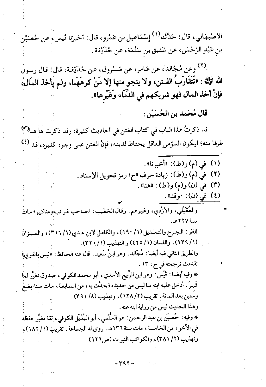 الْأَصْبَهَانِيُّ قَالَ: حَدَّثَنَا إِسْمَاعِيلُ بْنُ عَمْرٍو قَالَ: أَخْبَرَنَا قَيْسٌ، عَنْ حُصَيْنِ بْنِ عَبْدِ الرَّحْمَنِ، عَنْ شَقِيقِ بْنِ سَلَمَةَ، عَنْ حُذَيْفَةَ وَعَنْ مُجَالِدٍ، عَنْ عَامِرٍ، عَنْ مَسْرُوقٍ، عَنْ حُذَيْفَةَ قَالَ: قَالَ رَسُولُ اللَّهِ صَلَّى اللهُ عَلَيْهِ وَسَلَّمَ: «§تَتَقَارَبُ الْفِتَنُ، وَلَا يَنْجُو مِنْهَا إِلَّا مَنْ كَرِهَهَا، وَلَمْ يَأْخُذِ الْمَالَ، فَإِنْ أَخَذَ الْمَالَ فَهُوَ شَرِيكُهُمْ فِي الدِّمَاءِ وَغَيْرِهَا» قَالَ مُحَمَّدُ بْنُ الْحُسَيْنِ: قَدْ ذَكَرْتُ هَذَا الْبَابَ فِي كِتَابِ الْفِتَنِ فِي أَحَادِيثَ كَثِيرَةٍ، وَقَدْ ذَكَرْتُ هَاهُنَا طَرَفًا مِنْهَا؛ لِيَكُونَ الْمُؤْمِنُ الْعَاقِلُ يَحْتَاطُ لِدِينِهِ، فَإِنَّ الْفِتَنَ عَلَى وُجُوهٍ كَثِيرَةٍ، وَقَدْ