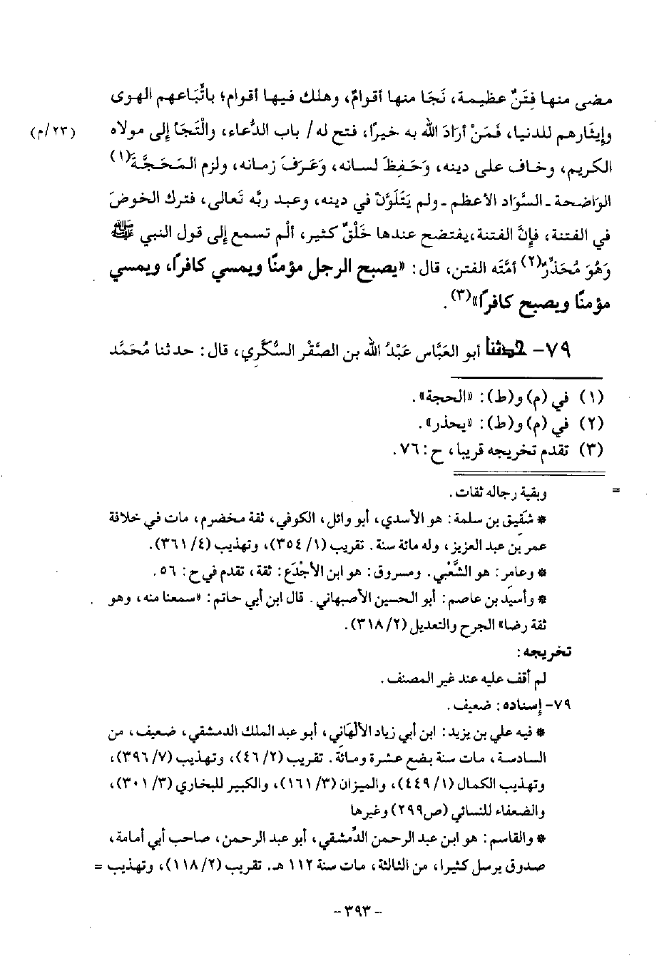 79 - حَدَّثَنَا أَبُو الْعَبَّاسِ عَبْدُ اللَّهِ بْنُ الصَّقْرِ السُّكَّرِيُّ قَالَ: حَدَّثَنَا مُحَمَّدُ -[394]- بْنُ الْمُصَفَّى قَالَ: حَدَّثَنَا الْوَلِيدُ بْنُ مُسْلِمٍ قَالَ: ثنا الْوَلِيدُ بْنُ سُلَيْمَانَ بْنِ أَبِي السَّائِبِ، عَنْ عَلِيِّ بْنِ يَزِيدَ، عَنِ الْقَاسِمِ، عَنْ أَبِي أُمَامَةَ: عَنِ النَّبِيِّ صَلَّى اللهُ عَلَيْهِ وَسَلَّمَ قَالَ: «§سَتَكُونُ فِتَنٌ يُصْبِحُ الرَّجُلُ فِيهَا مُؤْمِنًا وَيُمْسِي كَافِرًا، إِلَّا مَنْ أَحْيَاهُ اللَّهُ بِالْعِلْمِ»