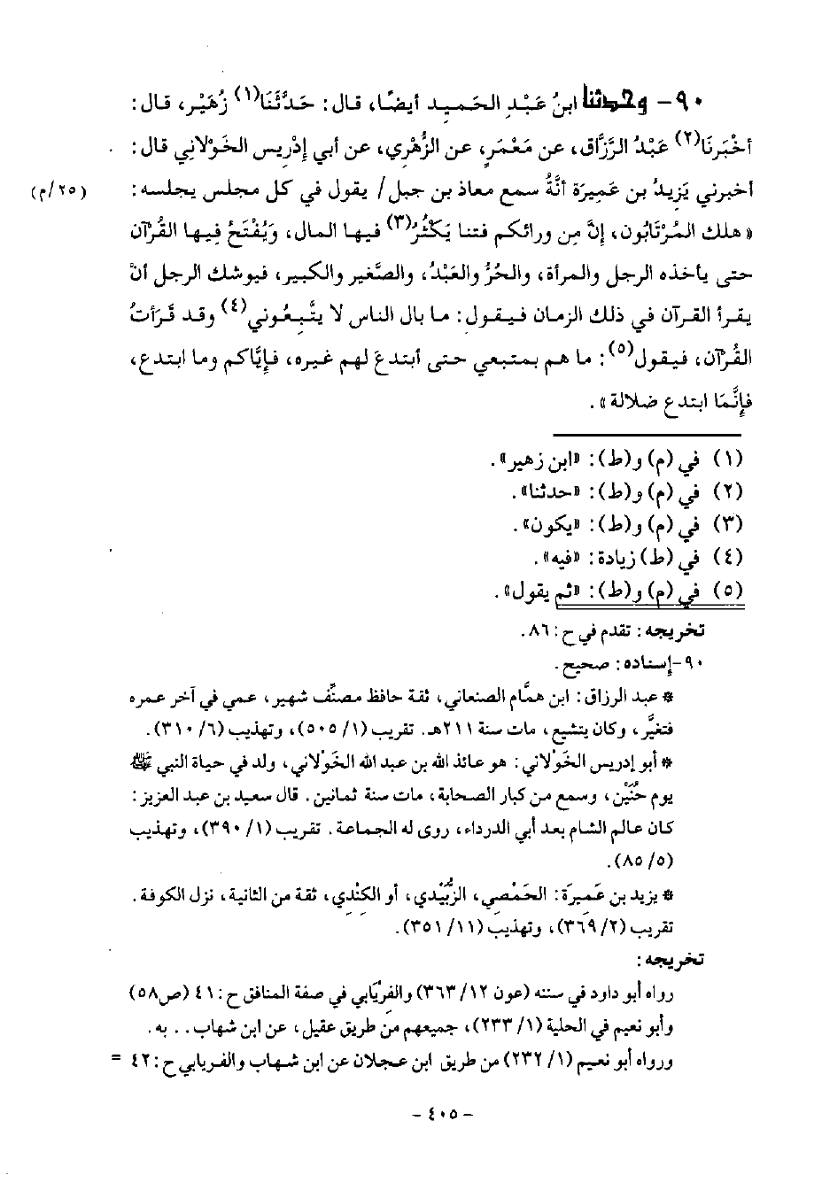 90 - وَحَدَّثَنَا ابْنُ عَبْدِ الْحَمِيدِ أَيْضًا قَالَ: حَدَّثَنَا زُهَيْرٌ قَالَ: أنا عَبْدُ الرَّزَّاقِ، عَنْ مَعْمَرٍ، عَنِ الزُّهْرِيِّ، عَنْ أَبِي إِدْرِيسَ الْخَوْلَانِيِّ قَالَ: أَخْبَرَنِي يَزِيدُ بْنُ عَمِيرَةَ، أَنَّهُ سَمِعَ مُعَاذَ بْنَ جَبَلٍ، رَضِيَ اللَّهُ عَنْهُ يَقُولُ فِي كُلِّ مَجْلِسٍ يَجْلِسُهُ: " §هَلَكَ الْمُرْتَابُونَ، إِنَّ مِنْ وَرَائِكُمْ فِتَنًا يَكْثُرُ فِيهَا الْمَالُ، وَيُفْتَحُ فِيهَا الْقُرْآنُ، حَتَّى يَأْخُذَهُ الرَّجُلُ وَالْمَرْأَةُ وَالْحُرُّ وَالْعَبْدُ، وَالصَّغِيرُ وَالْكَبِيرُ، فَيُوشِكُ الرَّجُلُ أَنْ يَقْرَأَ الْقُرْآنَ فِي ذَلِكَ الزَّمَانِ فَيَقُولُ: مَا بَالُ النَّاسِ لَا يَتَّبِعُونِي وَقَدْ قَرَأْتُ الْقُرْآنَ، فَيَقُولُ: مَا هُمْ بِمُتَّبِعِيَّ حَتَّى أَبْتَدِعَ لَهُمْ غَيْرَهُ، فَإِيَّاكُمْ وَمَا ابْتَدَعَ، فَإِنَّمَا ابْتَدَعَ ضَلَالَةً "