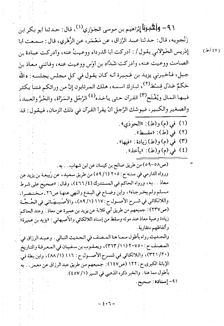91 - وَأَخْبَرَنَا إِبْرَاهِيمُ بْنُ مُوسَى الْجَوْزِيُّ قَالَ: حَدَّثَنَا أَبُو بَكْرِ بْنُ زَنْجُوَيْهِ قَالَ: حَدَّثَنَا عَبْدُ الرَّزَّاقِ، عَنْ مَعْمَرٍ، عَنِ الزُّهْرِيِّ قَالَ: سَمِعْتُ أَبَا إِدْرِيسَ الْخَوْلَانِيَّ، يَقُولُ: أَدْرَكْتُ أَبَا الدَّرْدَاءِ وَوَعَيْتُ عَنْهُ، وَأَدْرَكْتُ عُبَادَةَ بْنَ الصَّامِتِ وَوَعَيْتُ عَنْهُ، وَأَدْرَكْتُ شَدَّادَ بْنَ أَوْسٍ وَوَعَيْتُ عَنْهُ، وَفَاتَنِي مُعَاذُ بْنُ جَبَلٍ، فَأَخْبَرَنِي يَزِيدُ بْنُ عَمِيرَةَ، أَنَّهُ كَانَ يَقُولُ فِي كُلِّ مَجْلِسٍ يَجْلِسُهُ: " §اللَّهُ حَكَمٌ عَدْلٌ قِسْطٌ، تَبَارَكَ اسْمُهُ، هَلَكَ الْمُرْتَابُونَ، إِنَّ مِنْ وَرَائِكُمْ فِتَنًا يَكْثُرُ فِيهَا الْمَالُ، وَيُفْتَحُ فِيهَا الْقُرْآنُ، حَتَّى يَأْخُذَ الرَّجُلُ وَالْمَرْأَةُ، وَالْحُرُّ وَالْعَبْدُ، وَالصَّغِيرُ وَالْكَبِيرُ، فَيُوشِكُ الرَّجُلُ أَنْ يَقْرَأَ الْقُرْآنَ فِي ذَلِكَ الزَّمَانِ فَيَقُولَ: قَدْ -[407]- قَرَأْتُ الْقُرْآنَ فَمَا لِلنَّاسِ لَا يَتَّبِعُونِي، وَقَدْ قَرَأْتُ الْقُرْآنَ ثُمَّ يَقُولُ: مَا هُمْ بِمُتَّبِعِيَّ حَتَّى أَبْتَدِعَ لَهُمْ غَيْرَهُ، فَإِيَّاكُمْ وَمَا ابْتَدَعَ، فَإِنَّ مَا ابْتَدَعَ ضَلَالةٌ، اتَّقُوا زَيْغَةَ الْعَالِمِ، فَإِنَّ الشَّيْطَانَ يُلْقِي عَلَى فِيِّ الْحَكِيمِ كَلِمَةَ الضَّلَالَةِ، وَيُلْقِي الْمُنَافِقُ كَلِمَةَ الْحَقِّ قَالَ: قُلْنَا: وَمَا يُدْرِينَا رَحِمَكَ اللَّهُ أَنَّ الْمُنَافِقَ يُلْقِي كَلِمَةَ الْحَقِّ، وَأَنَّ الشَّيْطَانَ يُلْقِي عَلَى فِيِّ الْحَكِيمِ كَلِمَةَ الضَّلَالَةِ؟ قَالَ: اجْتَنِبُوا مِنْ كَلِمَةِ الْحَكِيمِ كُلَّ مُتَشَابِهٍ، الَّذِي إِذَا سَمِعْتَهُ قُلْتَ: مَا هَذِهِ؟ وَلَا يَنْأَيَنَّكَ ذَلِكَ عَنْهُ، فَإِنَّهُ لَعَلَّهُ أَنْ يُرَاجِعَ، وَيُلْقِي الْحَقَّ إِذَا سَمِعَهُ، فَإِنَّ عَلَى الْحَقِّ نُورًا "