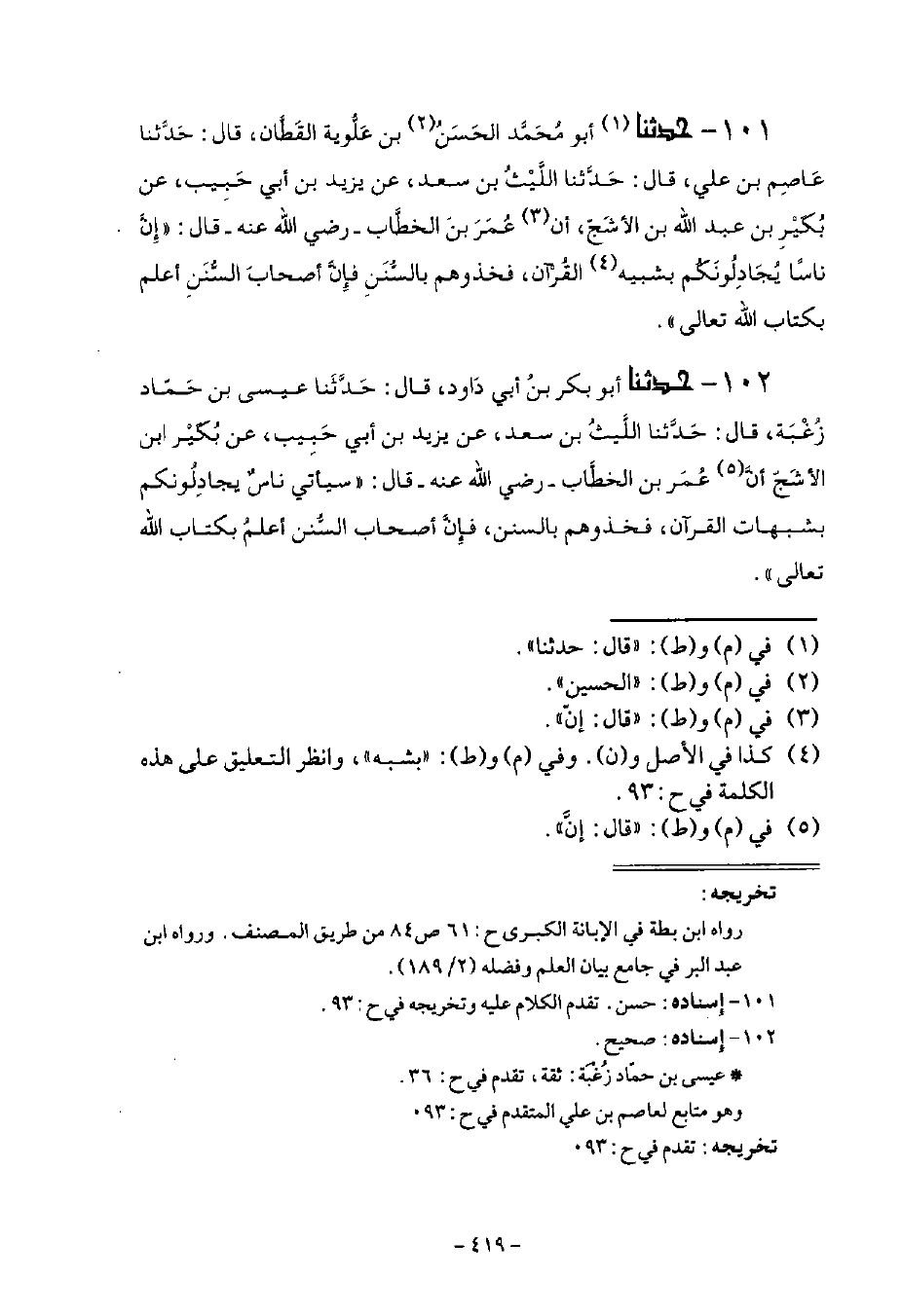101 - حَدَّثَنَا أَبُو مُحَمَّدٍ الْحَسَنُ بْنُ عَلُّويَةَ الْقَطَّانُ قَالَ: حَدَّثَنَا عَاصِمُ بْنُ عَلِيٍّ قَالَ: حَدَّثَنَا اللَّيْثُ بْنُ سَعْدٍ، عَنْ يَزِيدَ بْنِ أَبِي حَبِيبٍ، عَنْ بُكَيْرِ بْنِ عَبْدِ اللَّهِ بْنِ الْأَشَجِّ: أَنَّ عُمَرَ بْنَ الْخَطَّابِ رَضِيَ اللَّهُ عَنْهُ قَالَ: §إِنَّ نَاسًا يُجَادِلُونَكُمْ بِشَبِيهِ الْقُرْآنِ، فَخُذُوهُمْ بِالسُّنَنِ، فَإِنَّ أَصْحَابَ السُّنَنِ أَعْلَمُ بِكِتَابِ اللَّهِ تَعَالَى