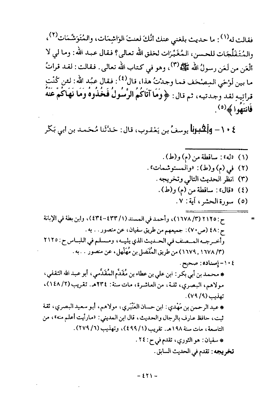 104 - أَخْبَرَنَا يُوسُفُ بْنُ يَعْقُوبَ قَالَ: حَدَّثَنَا مُحَمَّدُ بْنُ أَبِي بَكْرٍ -[422]- الْمُقَدَّمِيُّ قَالَ: حَدَّثَنَا عَبْدُ الرَّحْمَنِ بْنُ مَهْدِيٍّ قَالَ: حَدَّثَنَا سُفْيَانُ، عَنْ مَنْصُورٍ، عَنْ إِبْرَاهِيمَ، عَنْ عَلْقَمَةَ، عَنْ عَبْدِ اللَّهِ قَالَ: «§لَعَنَ رَسُولُ اللَّهِ صَلَّى اللهُ عَلَيْهِ وَسَلَّمَ الْوَاشِمَاتِ» فَذَكَرَ نَحْوَ الْحَدِيثِ قَبْلَهُ