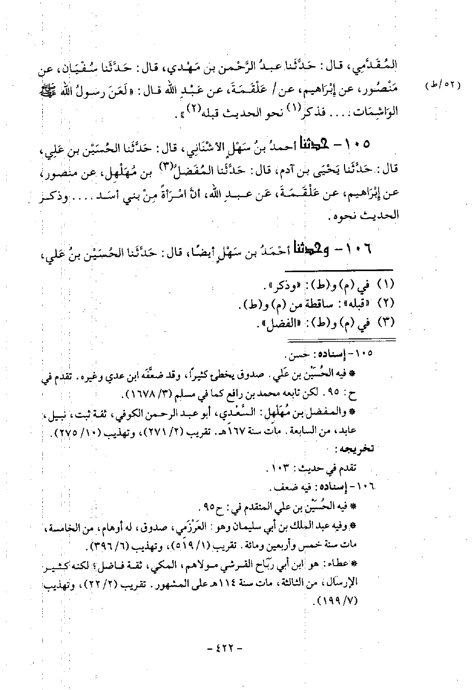 106 - وَحَدَّثَنَا أَحْمَدُ بْنُ سَهْلٍ أَيْضًا قَالَ: حَدَّثَنَا الْحُسَيْنُ بْنُ عَلِيٍّ -[423]- قَالَ: حَدَّثَنَا يَحْيَى بْنُ آدَمَ قَالَ: حَدَّثَنَا ابْنُ الْمُبَارَكِ، عَنْ عَبْدِ الْمَلِكِ بْنِ أَبِي سُلَيْمَانَ , عَنْ عَطَاءٍ: فِي قَوْلِ اللَّهِ تَعَالَى {§فَإِنْ تَنَازَعْتُمْ فِي شَيْءٍ فَرُدُّوهُ إِلَى اللَّهِ وَالرَّسُولِ} [النساء: 59] قَالَ: إِلَى اللَّهِ: إِلَى كِتَابِ اللَّهِ , وَإِلَى الرَّسُولِ إِلَى سُنَّةِ رَسُولِ اللَّهِ صَلَّى اللهُ عَلَيْهِ وَسَلَّمَ