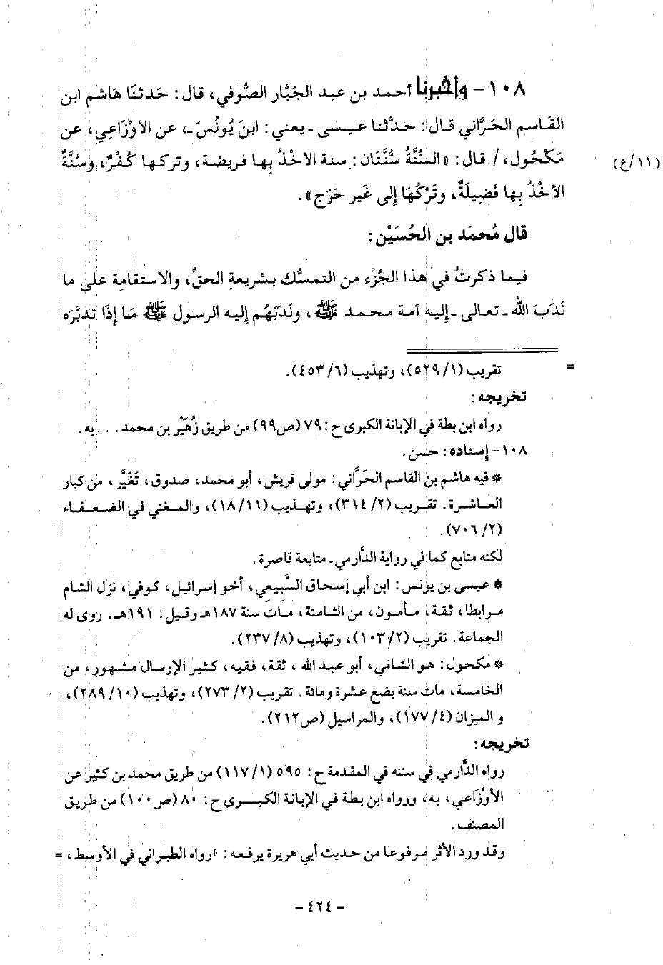 108 - وَأَخْبَرَنَا أَحْمَدُ بْنُ عَبْدِ الْجَبَّارِ الصُّوفِيُّ قَالَ: حَدَّثَنَا هَاشِمُ بْنُ الْقَاسِمِ الْحَرَّانِيُّ قَالَ: حَدَّثَنَا عِيسَى يَعْنِي ابْنَ يُونُسَ، عَنِ الْأَوْزَاعِيِّ، عَنْ مَكْحُولٍ قَالَ: §السُّنَّةُ سُنَّتَانِ: سُنَّةٌ الْأَخْذُ بِهَا فَرِيضَةٌ، وَتَرْكُهَا كُفْرٌ وَسُنَّةٌ الْأَخْذُ بِهَا فَضِيلَةٌ، وَتَرْكُهَا إِلَى غَيْرِ حَرَجٍ قَالَ مُحَمَّدُ بْنُ الْحُسَيْنِ: فِيمَا ذَكَرْتُ فِي هَذَا الْجُزْءِ مِنَ التَّمَسُّكِ بِشَرِيعَةِ الْحَقِّ، وَالِاسْتِقَامَةِ عَلَى مَا نَدَبَ اللَّهُ تَعَالَى إِلَيْهِ أُمَّةَ مُحَمَّدٍ صَلَّى اللهُ عَلَيْهِ وَسَلَّمَ، وَنَدَبَهُمْ إِلَيْهِ الرَّسُولُ صَلَّى اللهُ عَلَيْهِ وَسَلَّمَ: مَا إِذَا تَدَبَّرَهُ -[425]- الْعَاقِلُ عَلِمَ أَنَّهُ قَدْ أَلْزَمَهُ التَّمَسُّكَ بِكِتَابِ اللَّهِ تَعَالَى، وَسُنَّةِ رَسُولِ اللَّهِ صَلَّى اللهُ عَلَيْهِ وَسَلَّمَ، وَبِسُنَّةِ الْخُلَفَاءِ الرَّاشِدِينَ , وَجَمِيعِ الصَّحَابَةِ رَضِيَ اللَّهُ عَنْهُمْ , وَجَمِيعِ مَنْ تَبِعَهُمْ بِإِحْسَانٍ، وَأَئِمَّةِ الْمُسْلِمِينَ، وَتَرْكِ الْجِدَالِ وَالْمِرَاءِ وَالْخُصُومَةِ فِي الدِّينِ، وَلَزِمَ مُجَانَبَةُ أَهْلِ الْبِدَعِ , وَالِاتِّبَاعُ , وَتَرْكُ الِابْتِدَاعُ , فَقَدْ كَفَانَا عِلْمُ مَنْ مَضَى مِنْ أَئِمَّةِ الْمُسْلِمِينَ الَّذِينَ لَا يُسْتَوْحَشُ عَنْ ذِكْرِهِمْ، مِنْ مَذَاهِبِ أَهْلِ الْبِدَعِ وَالضَّلَالَاتِ، وَاللَّهُ الْمُوَفِّقُ لِكُلِّ رَشَادٍ، وَالْمُعِينُ عَلَيْهِ