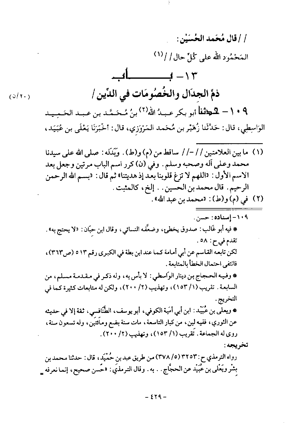 109 - حَدَّثَنَا أَبُو بَكْرٍ عَبْدُ اللَّهِ بْنُ مُحَمَّدِ بْنِ عَبْدِ الْحَمِيدِ الْوَاسِطِيُّ قَالَ: حَدَّثَنَا زُهَيْرُ بْنُ مُحَمَّدٍ الْمَرْوَزِيُّ قَالَ: أنا يَعْلَى بْنُ عُبَيْدٍ -[430]- قَالَ: نا الْحَجَّاجُ بْنُ دِينَارٍ، عَنْ أَبِي غَالِبٍ، عَنْ أَبِي أُمَامَةَ رَضِيَ اللَّهُ عَنْهُ قَالَ: قَالَ رَسُولُ اللَّهِ صَلَّى اللهُ عَلَيْهِ وَسَلَّمَ: " §مَا ضَلَّ قَوْمٌ بَعْدَ هُدًى كَانُوا عَلَيْهِ إِلَّا أُوتُوا الْجَدَلَ، ثُمَّ قَرَأَ: {مَا ضَرَبُوهُ لَكَ إِلَّا جَدَلًا بَلْ هُمْ قَوْمٌ خَصِمُونَ} [الزخرف: 58]