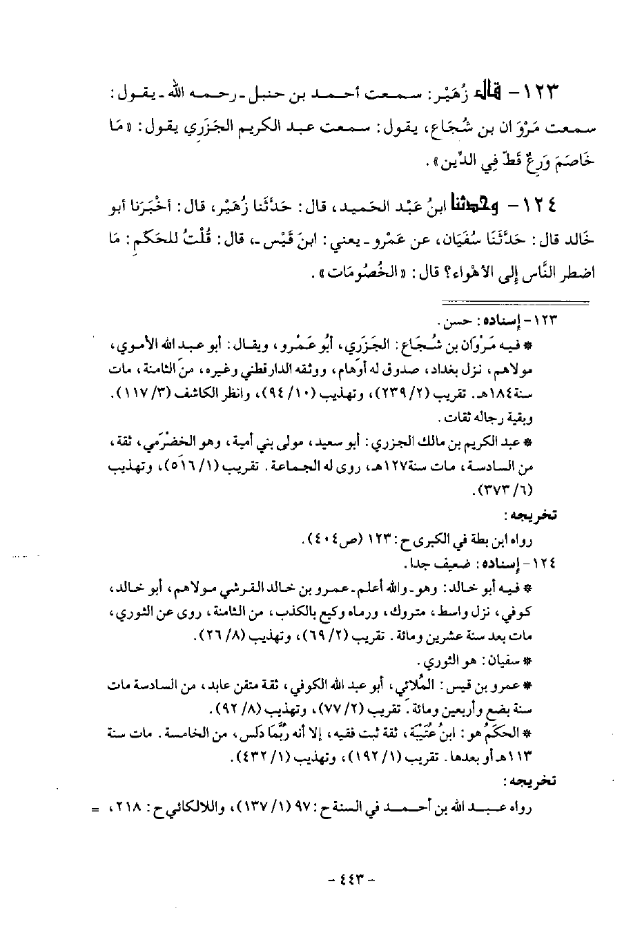 123 - قَالَ زُهَيْرٌ: سَمِعْتُ أَحْمَدَ بْنَ حَنْبَلٍ رَحِمَهُ اللَّهُ يَقُولُ: سَمِعْتُ مَرْوَانَ بْنَ شُجَاعٍ يَقُولُ: سَمِعْتُ عَبْدَ الْكَرِيمِ الْجَزَرِيَّ يَقُولُ: §مَا خَاصَمَ وَرِعٌ قَطُّ فِي الدِّينِ