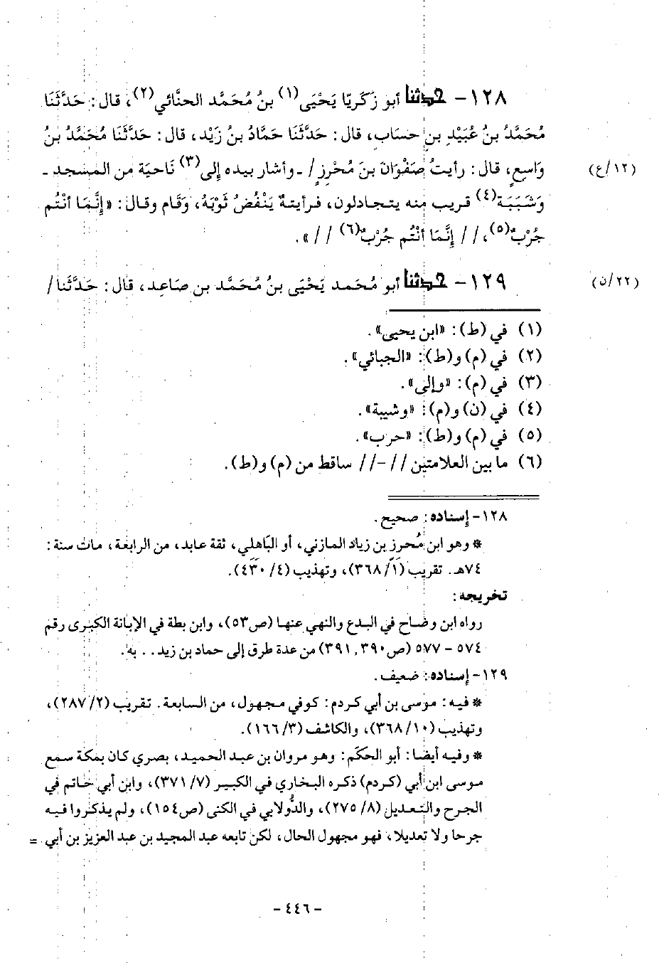 128 - حَدَّثَنَا أَبُو زَكَرِيَّا يَحْيَى بْنُ مُحَمَّدٍ الْحِنَّائِيُّ قَالَ: حَدَّثَنَا مُحَمَّدُ بْنُ عُبَيْدِ بْنِ حَسَّابٍ قَالَ: حَدَّثَنَا حَمَّادُ بْنُ زَيْدٍ قَالَ: حَدَّثَنَا مُحَمَّدُ بْنُ وَاسِعٍ قَالَ: رَأَيْتُ صَفْوَانَ بْنَ مُحْرِزٍ وَأَشَارَ بِيَدِهِ إِلَى نَاحِيَةٍ مِنَ الْمَسْجِدِ، وَشَبَبَةُ قَرِيبٌ مِنْهُ، يَتَجَادَلُونَ، فَرَأَيْتُهُ يَنْفُضُ ثَوْبَهُ وَقَامَ وَقَالَ: §إِنَّمَا أَنْتُمْ جَرَبٌ إِنَّمَا أَنْتُمْ جَرَبٌ
