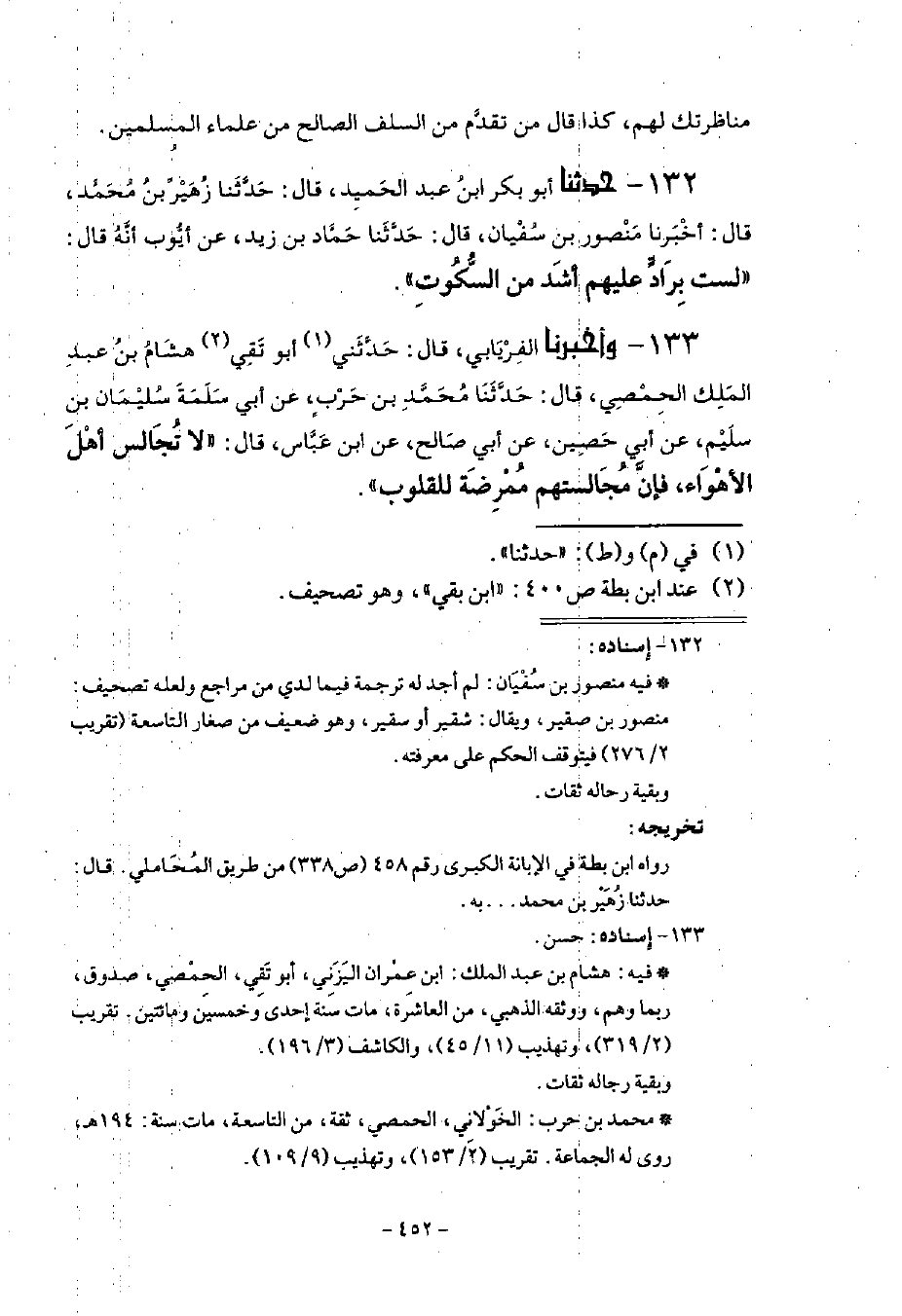 133 - أَخْبَرَنَا الْفِرْيَابِيُّ قَالَ: حَدَّثَنَا أَبُو تَقِيٍّ هِشَامُ بْنُ عَبْدِ الْمَلِكِ الْحِمْصِيُّ قَالَ: حَدَّثَنَا مُحَمَّدُ بْنُ حَرْبٍ، عَنْ أَبِي سَلَمَةَ سُلَيْمَانَ بْنِ سُلَيْمٍ، عَنْ أَبِي حُصَيْنٍ، عَنْ أَبِي صَالِحٍ، عَنِ ابْنِ عَبَّاسٍ قَالَ: §لَا تُجَالِسْ أَهْلَ الْأَهْوَاءِ، فَإِنَّ مُجَالَسَتَهُمْ مَمْرَضَةٌ لِلْقُلُوبِ
