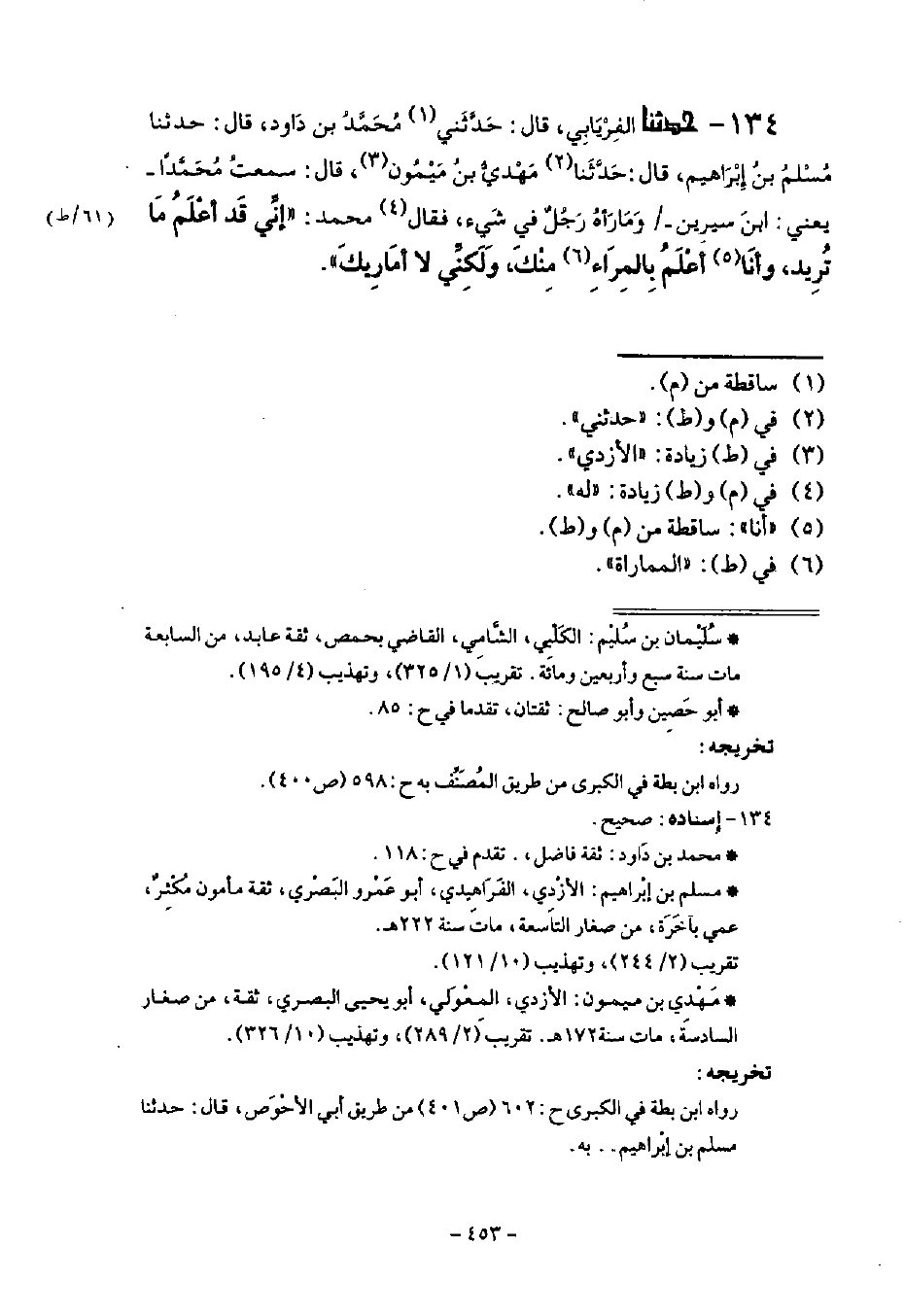 143 - حَدَّثَنَا الْفِرْيَابِيُّ قَالَ: حَدَّثَنِي مُحَمَّدُ بنُ دَاوُدَ قَالَ: حَدَّثَنَا مُسْلِمُ بْنُ إِبْرَاهِيمَ قَالَ: حَدَّثَنَا مَهْدِيُّ بْنُ مَيْمُونٍ قَالَ: سَمِعْتُ مُحَمَّدًا يَعْنِي ابْنَ سِيرِينَ: وَمَارَاهُ رَجُلٌ فِي شَيْءٍ فَقَالَ مُحَمَّدٌ: §إِنِّي أَعْلَمُ مَا تُرِيدُ، وَأَنَا أَعْلَمُ بِالْمِرَاءِ مِنْكَ، وَلَكِنِّي لَا أُمَارِيكَ -[454]- قَالَ مُحَمَّدُ بْنُ الْحُسَيْنِ: أَلَمْ تَسْمَعْ رَحِمَكَ اللَّهُ إِلَى مَا تَقَدَّمَ ذِكْرُنَا لَهُ مِنْ قَوْلِ أَبِي قِلَابَةَ: لَا تُجَالِسُوا أَهْلَ الْأَهْوَاءِ وَلَا تُجَادِلُوهُمْ، فَإِنِّي لَا آمَنُ أَنْ يَغْمِسُوكُمْ فِي الضَّلَالَةِ، أَوْ يَلْبِسُوا عَلَيْكُمْ فِي الدِّينِ بَعْضَ مَا لُبِّسَ عَلَيْهِمْ أَوَ لَمْ تَسْمَعْ إِلَى قَوْلِ الْحَسَنِ وَقَدْ سَأَلَهُ عَنْ مَسْأَلَةٍ فَقَالَ: أَلَا تُنَاظِرُنِي فِي الدِّينِ؟ فَقَالَ لَهُ الْحَسَنُ: أَمَّا أَنَا فَقَدْ أَبْصَرْتُ دِينِي، فَإِنْ كُنْتَ أَنْتَ أَضْلَلْتَ دِينَكَ فَالْتَمِسْهُ أَوَ لَمْ تَسْمَعْ إِلَى قَوْلِ عُمَرَ بْنِ عَبْدِ الْعَزِيزِ: مَنْ جَعَلَ دِينَهُ غَرَضًا لِلْخُصُومَاتِ أَكْثَرَ التَّنَقُّلَ قَالَ مُحَمَّدُ بْنُ الْحُسَيْنِ رَحِمَهُ اللَّهُ: فَمَنِ اقْتَدَى بِهَؤُلَاءِ الْأَئِمَّةِ سَلِمَ لَهُ دِينُهُ إِنْ شَاءَ اللَّهُ تَعَالَى، فَإِنْ قَالَ قَائِلٌ: فَإِنِ اضْطَّرَّنِي فِي الْأَمْرِ وَقْتًا مِنَ الْأَوْقَاتِ إِلَى مُنَاظَرَتِهِمْ , وَإِثْبَاتِ الْحُجَّةِ عَلَيْهِمْ أَلَا أُنَاظِرُهُمْ؟ قِيلَ لَهُ: الِاضْطِرَارُ إِنَّمَا يَكُونُ مَعَ إِمَامٍ لَهُ مَذْهَبٌ سُوءٌ، فَيَمْتَحِنُ النَّاسَ -[455]- وَيَدْعُوهُمْ إِلَى مَذْهَبِهِ، كَفِعْلِ مَنْ مَضَى فِي وَقْتِ أَحْمَدَ بْنِ حَنْبَلٍ: ثَلَاثَةُ خُلَفَاءَ امْتَحَنُوا النَّاسَ، وَدَعَوْهُمْ إِلَى مَذْهَبِهِمُ السُّوءِ، فَلَمْ يَجِدِ الْعُلَمَاءُ بُدًّا مِنَ الذَّبِّ عَنِ الدِّينِ، وَأَرَادُوا بِذَلِكَ مَعْرِفَةَ الْعَامَّةِ الْحَقَّ مِنَ الْبَاطِلِ، فَنَاظَرُوهُمْ ضَرُورَةً لَا اخْتِيَارًا، فَأَثْبَتَ اللَّهُ تَعَالَى الْحَقَّ مَعَ أَحْمَدَ بْنِ حَنْبَلٍ وَمَنْ كَانَ عَلَى طَرِيقَتِهِ وَأَذَلَّ اللَّهُ تَعَالَى الْمُعْتَزِلَةَ وَفَضَحَهُمْ وَعَرَفَتِ الْعَامَّةُ أَنَّ الْحَقَّ مَا كَانَ عَلَيْهِ أَحْمَدُ وَمَنْ تَابَعَهُ إِلَى يَوْمِ الْقِيَامَةِ، أَرْجُو أَنْ يُعِيذَ اللَّهُ الْكَرِيمُ أَهْلَ الْعِلْمِ مِنْ أَهْلِ السُّنَّةِ وَالْجَمَاعَةِ مِنْ مِحْنَةٍ تَكُونُ أَبَدًا وَبَلَغَنِي عَنِ الْمَهْتَدِي رَحِمَهُ اللَّهُ أَنَّهُ قَالَ: مَا فَظَّعَ أَبِي يَعْنِي الْوَاثِقَ إِلَّا شَيْخٌ جِيءَ بِهِ مِنَ الْمَصِيصَةِ، فَمَكَثَ فِي السِّجْنِ مُدَّةً، ثُمَّ إِنَّ أَبِي ذَكَرَهُ يَوْمًا، فَقَالَ: عَلَيَّ بِالشَّيْخِ، فَأُتِيَ بِهِ مُقَيَّدًا، فَلَمَّا أُوقِفَ بَيْنَ يَدَيْهِ سَلَّمَ فَلَمْ يَرُدَّ عَلَيْهِ السَّلَامَ، فَقَالَ لَهُ الشَّيْخُ: يَا أَمِيرَ الْمُؤْمِنِينَ، مَا اسْتَعْمَلْتَ مَعِي أَدَبَ اللَّهِ تَعَالَى، وَلَا أَدَبَ رَسُولِهِ صَلَّى اللهُ عَلَيْهِ وَسَلَّمَ قَالَ اللَّهُ تَعَالَى: {وَإِذَا -[456]- حُيِّيتُمْ بِتَحِيَّةٍ فَحَيُّوا بِأَحْسَنَ مِنْهَا أَوْ رُدُّوهَا} [النساء: 86] وَأَمَرَ النَّبِيُّ صَلَّى اللهُ عَلَيْهِ وَسَلَّمَ بِرَدِّ السَّلَامِ، فَقَالَ لَهُ: وَعَلَيْكَ السَّلَامُ، ثُمَّ قَالَ لِابْنِ أَبِي دُؤَادٍ: سَلْهُ، فَقَالَ يَا أَمِيرَ الْمُؤْمِنِينَ: أَنَا مَحْبُوسٌ مُقَيَّدٌ، أُصَلِّي فِي الْحَبْسِ بِتَيَمُّمٍ، مُنِعْتُ الْمَاءَ فَمُرْ بِقُيُودِي تُحَلُّ، وَمُرْ لِي بِمَاءٍ أَتَطَهَّرُ وَأُصَلِّي، ثُمَّ سَلْنِي قَالَ: فَأَمَرَ، فَحَلَّ قَيْدَهُ وَأَمَرَ لَهُ بِمَاءٍ، فَتَوَ