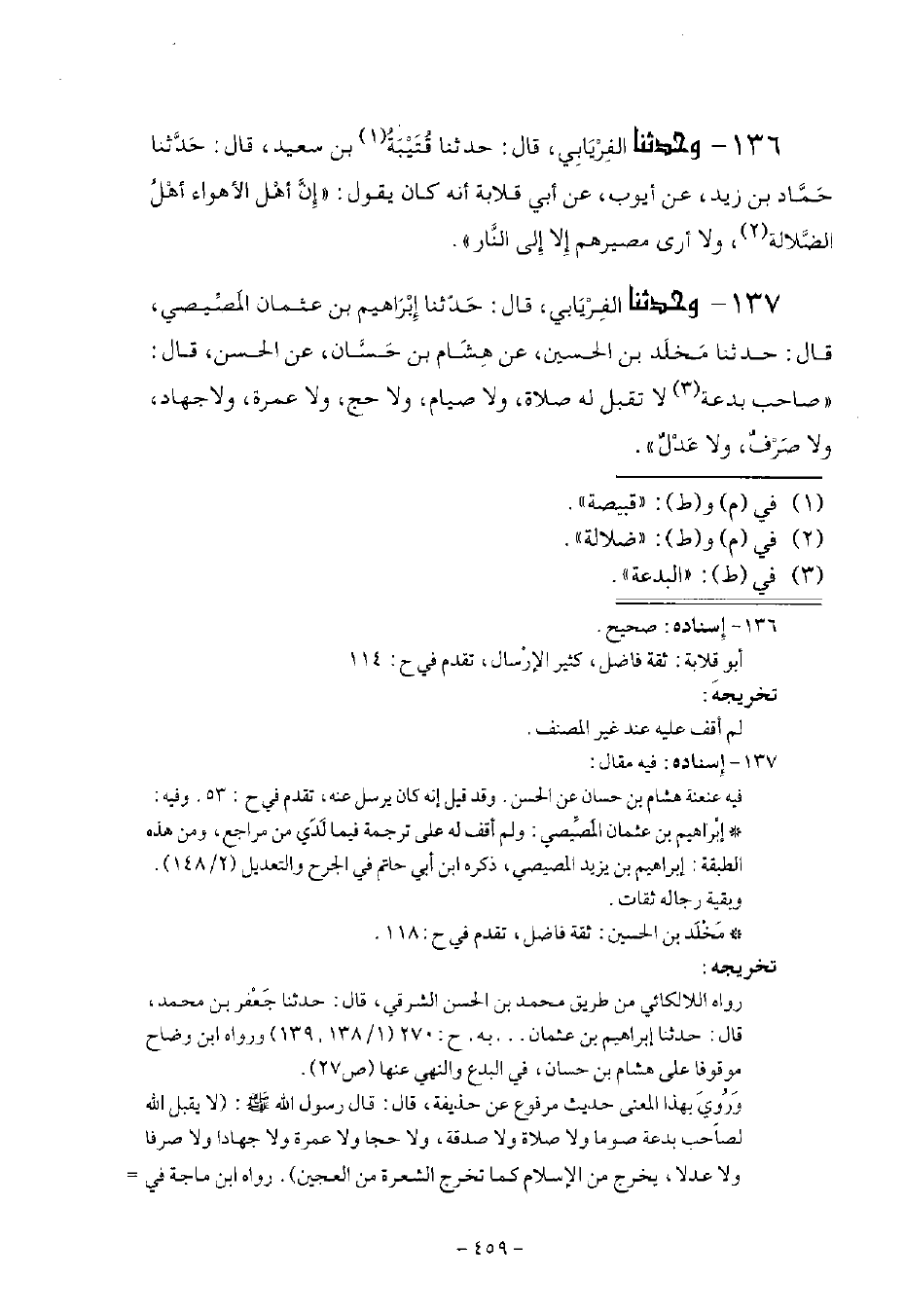 وَحَدَّثَنَا الْفِرْيَابِيُّ قَالَ: حَدَّثَنَا إِبْرَاهِيمُ بنُ عُثْمَانَ الْمِصِّيصِيُّ قَالَ: حَدَّثَنَا مَخْلَدُ بْنُ الْحُسَيْنِ، عَنْ هِشَامِ بْنِ حَسَّانَ، عَنِ الْحَسَنِ قَالَ: §صَاحِبُ الْبِدْعَةِ لَا تُقْبَلُ لَهُ صَلَاةٌ وَلَا صِيَامٌ وَلَا حَجٌّ وَلَا عُمْرَةٌ وَلَا جِهَادٌ، وَلَا صَرْفٌ وَلَا عَدْلٌ