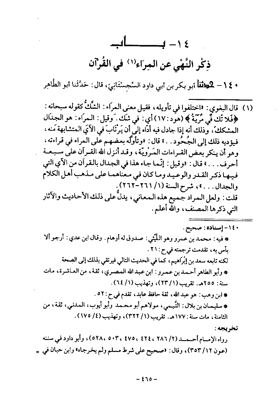 حَدَّثَنَا أَبُو بَكْرِ بْنُ أَبِي دَاوُدَ السِّجِسْتَانِيُّ قَالَ: حَدَّثَنَا أَبُو الطَّاهِرِ -[466]- أَحْمَدُ بْنُ عَمْرٍو قَالَ: أنا ابْنُ وَهْبٍ قَالَ: أَخْبَرَنِي سُلَيْمَانُ بْنُ بِلَالٍ، عَنْ مُحَمَّدِ بْنِ عَمْرٍو، عَنْ أَبِي سَلَمَةَ بْنِ عَبْدِ الرَّحْمَنِ، عَنْ أَبِي هُرَيْرَةَ أَنَّ رَسُولَ اللَّهِ صَلَّى اللهُ عَلَيْهِ وَسَلَّمَ قَالَ: «§مِرَاءٌ فِي الْقُرْآنِ كُفْرٌ»