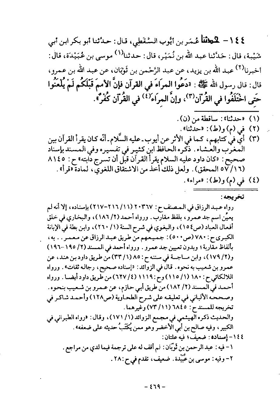 144 - حَدَّثَنَا عُمَرُ بْنُ أَيُّوبَ السَّقَطِيُّ قَالَ: حَدَّثَنَا أَبُو بَكْرِ بْنُ أَبِي شَيْبَةَ قَالَ: حَدَّثَنَا عَبْدُ اللَّهِ بْنُ نُمَيْرٍ قَالَ: مُوسَى بْنُ عُبَيْدَةَ قَالَ: أنا عَبْدُ اللَّهِ بْنُ يَزِيدَ، عَنْ عَبْدِ الرَّحْمَنِ بْنِ ثَوْبَانَ، عَنْ عَبْدِ اللَّهِ بْنِ عَمْرٍو قَالَ: قَالَ رَسُولُ اللَّهِ صَلَّى اللهُ عَلَيْهِ وَسَلَّمَ: «§دَعُوا الْمِرَاءَ فِي الْقُرْآنِ، فَإِنَّ الْأُمَمَ قَبْلَكُمْ لَمْ يُلْعَنُوا حَتَّى اخْتَلَفُوا فِي الْقُرْآنِ، وَإِنَّ الْمِرَاءَ فِي الْقُرْآنِ كُفْرٌ»