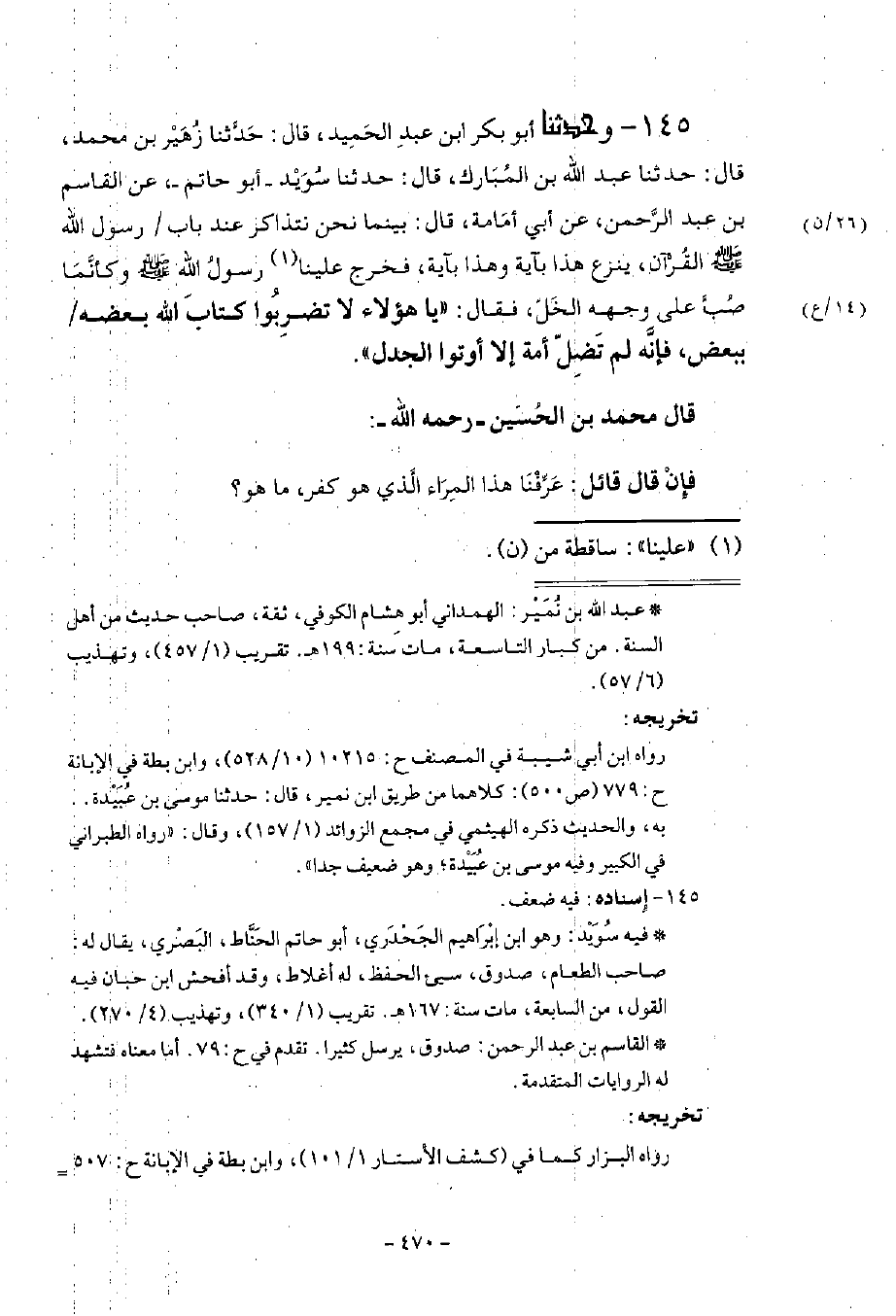 145 - وَحَدَّثَنَا أَبُو بَكْرِ بْنُ عَبْدِ الْحَمِيدِ قَالَ: حَدَّثَنَا زُهَيْرُ بْنُ مُحَمَّدٍ قَالَ: حَدَّثَنَا عَبْدُ اللَّهِ بْنُ الْمُبَارَكِ قَالَ: حَدَّثَنَا سُوَيْدٌ أَبُو حَاتِمٍ، عَنِ الْقَاسِمِ بْنِ عَبْدِ الرَّحْمَنِ، عَنْ أَبِي أُمَامَةَ قَالَ: بَيْنَمَا نَحْنُ نَتَذَاكَرُ عِنْدَ بَابِ رَسُولِ اللَّهِ صَلَّى اللهُ عَلَيْهِ وَسَلَّمَ الْقُرْآنَ، يَنْزِعُ هَذَا بِآيَةٍ وَهَذَا بِآيَةٍ فَخَرَجَ عَلَيْنَا رَسُولُ اللَّهِ صَلَّى اللهُ عَلَيْهِ وَسَلَّمَ وَكَأَنَّمَا صُبَّ عَلَى وَجْهِهِ الْخَلُّ، فَقَالَ: «يَا هَؤُلَاءِ، §لَا تَضْرِبُوا كِتَابَ اللَّهِ بَعْضَهُ بِبَعْضٍ، فَإِنَّهُ لَمْ تَضِلَّ أُمَّةٌ إِلَّا أُوتُوا الْجَدَلَ» قَالَ مُحَمَّدُ بْنُ الْحُسَيْنِ رَحِمَهُ اللَّهُ: فَإِنْ قَالَ قَائِلٌ: عَرَفْنَا هَذَا الْمِرَاءَ الَّذِي هُوَ كُفْرٌ , مَا هُوَ؟ -[471]- قِيلَ لَهُ: نَزَلَ هَذَا الْقُرْآنُ عَلَى رَسُولِ اللَّهِ صَلَّى اللهُ عَلَيْهِ وَسَلَّمَ عَلَى سَبْعَةِ أَحْرُفٍ، وَمَعْنَاهَا: عَلَى سَبْعِ لُغَاتٍ، فَكَانَ رَسُولُ اللَّهِ صَلَّى اللهُ عَلَيْهِ وَسَلَّمَ يُلَقِّنُ كُلَّ قَبِيلَةٍ مِنَ الْعَرَبِ الْقُرْآنَ عَلَى حَسَبِ مَا يَحْتَمِلُ مِنْ لُغَتِهِمْ، تَخْفِيفًا مِنَ اللَّهِ تَعَالَى بِأُمَّةِ مُحَمَّدٍ صَلَّى اللهُ عَلَيْهِ وَسَلَّمَ، فَكَانُوا رُبَّمَا إِذَا الْتَقَوْا، يَقُولُ بَعْضُهُمْ لِبَعْضٍ: لَيْسَ هَكَذَا الْقُرْآنُ، وَلَيْسَ هَكَذَا عَلَّمَنَا رَسُولُ اللَّهِ صَلَّى اللهُ عَلَيْهِ وَسَلَّمَ، وَيَعِيبُ بَعْضُهُمْ قِرَاءَةَ بَعْضٍ فَنُهُوا عَنْ هَذَا: اقْرَءُوا كَمَا عَلِمْتُمْ، وَلَا يَجْحَدُ بَعْضُكُمْ قِرَاءَةَ بَعْضٍ، وَاحْذَرُوا الْجِدَالَ -[472]- وَالْمِرَاءَ فِيمَا قَدْ تَعَلَّمْتُمْ، وَالْحُجَّةُ فِيمَا قُلْنَا