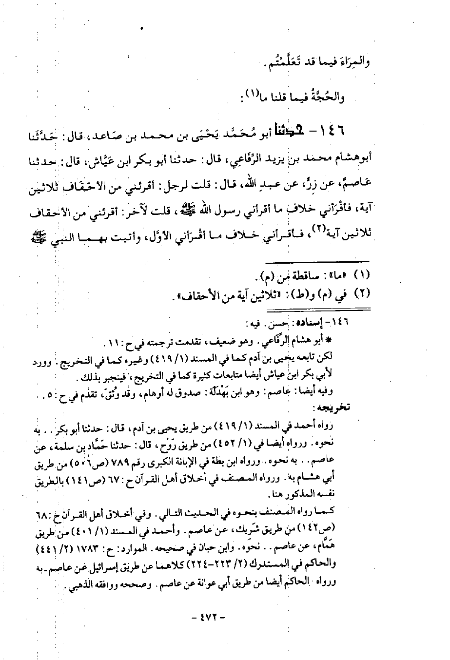 146 - حَدَّثَنَا أَبُو مُحَمَّدٍ يَحْيَى بْنُ مُحَمَّدِ بْنِ صَاعِدٍ قَالَ: حَدَّثَنَا أَبُو هِشَامٍ مُحَمَّدُ بْنُ يَزِيدَ الرِّفَاعِيُّ قَالَ: حَدَّثَنَا أَبُو بَكْرِ بْنُ عَيَّاشٍ قَالَ حَدَّثَنَا عَاصِمٌ، عَنْ زِرٍّ، عَنْ عَبْدِ اللَّهِ قَالَ: قُلْتُ لِرَجُلٍ: أَقْرِئْنِي مِنَ الْأَحْقَافِ ثَلَاثِينَ آيَةً، فَأَقْرَأَنِي خِلَافَ مَا أَقْرَأَنِي رَسُولُ اللَّهِ صَلَّى اللهُ عَلَيْهِ وَسَلَّمَ، قُلْتُ لِآخَرَ: أَقْرِئْنِي مِنَ الْأَحْقَافِ ثَلَاثِينَ آيَةً، فَأَقْرَأَنِي خِلَافَ مَا أَقْرَأَنِيَ الْأَوَّلُ، وَأَتَيْتُ بِهِمَا النَّبِيَّ صَلَّى اللهُ عَلَيْهِ وَسَلَّمَ -[473]-، فَغَضِبَ، وَعَلِيُّ بْنُ أَبِي طَالِبٍ رَضِيَ اللَّهُ عَنْهُ عِنْدَهُ جَالِسٌ فَقَالَ عَلِيٌّ كَرَّمَ اللَّهُ وَجْهَهُ: قَالَ لَكُمْ: «§اقْرَءُوا كَمَا عَلِمْتُمْ»