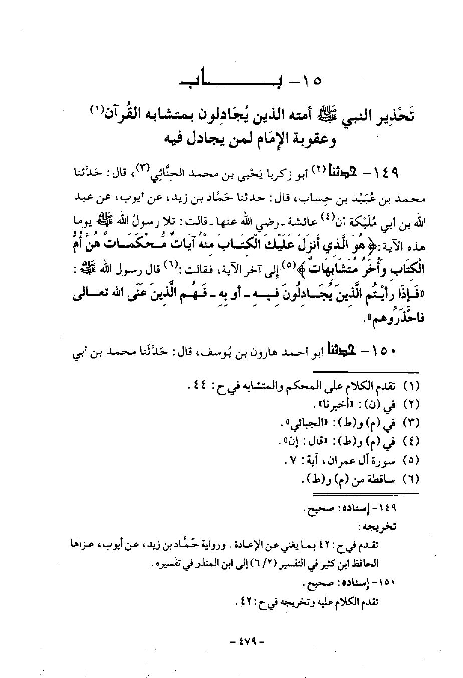 149 - أَخْبَرَنَا أَبُو زَكَرِيَّا يَحْيَى بْنُ مُحَمَّدٍ الْحِنَّائِيُّ قَالَ: حَدَّثَنَا مُحَمَّدُ بْنُ عُبَيْدِ بْنِ حَسَّابٍ قَالَ: حَدَّثَنَا حَمَّادُ بْنُ زَيْدٍ، عَنْ أَيُّوبَ، عَنْ عَبْدِ اللَّهِ بْنِ أَبِي مُلَيْكَةَ، أَنَّ عَائِشَةَ رَضِيَ اللَّهُ عَنْهَا قَالَتْ: تَلَا رَسُولُ اللَّهِ صَلَّى اللهُ عَلَيْهِ وَسَلَّمَ يَوْمًا هَذِهِ الْآيَةَ: {§هُوَ الَّذِي أَنْزَلَ عَلَيْكَ الْكِتَابَ مِنْهُ آيَاتٌ مُحْكَمَاتٌ هُنَّ أُمُّ الْكِتَابِ، وَأُخَرُ مُتَشَابِهَاتٌ} [آل عمران: 7] إِلَى آخِرِ الْآيَةِ فَقَالَتْ: قَالَ رَسُولُ اللَّهِ صَلَّى اللهُ عَلَيْهِ وَسَلَّمَ: «فَإِذَا رَأَيْتُمُ الَّذِينَ يُجَادِلُونَ فِيهِ، أَوْ بِهِ، فَهُمُ الَّذِينَ عَنَى اللَّهُ تَعَالَى، فَاحْذَرُوهُمْ»