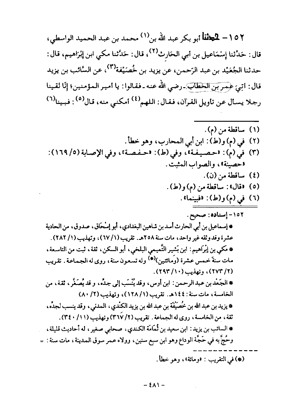 حَدَّثَنَا أَبُو بَكْرٍ عَبْدُ اللَّهِ بْنُ مُحَمَّدِ بْنِ عَبْدِ الْحَمِيدِ الْوَاسِطِيُّ قَالَ: حَدَّثَنَا إِسْمَاعِيلُ بْنُ أَبِي الْحَارِثِ قَالَ: حَدَّثَنَا مَكِّيُّ بْنُ إِبْرَاهِيمَ قَالَ: حَدَّثَنَا الْجُعَيْدُ بْنُ عَبْدِ الرَّحْمَنِ، عَنْ يَزِيدَ بْنِ خُصَيْفَةَ، عَنِ السَّائِبِ بْنِ يَزِيدَ قَالَ: أُتِيَ عُمَرُ بْنُ الْخَطَّابِ رَضِيَ اللَّهُ عَنْهُ فَقَالُوا: يَا أَمِيرَ الْمُؤْمِنِينَ، إِنَّا لَقِينَا رَجُلًا يَسْأَلُ عَنْ تَأْوِيلِ الْقُرْآنِ، فَقَالَ: اللَّهُمَّ أَمْكِنِّي مِنْهُ قَالَ: فَبَيْنَا -[482]- عُمَرُ ذَاتَ يَوْمٍ يُغَدِّي النَّاسَ، إِذْ جَاءَهُ رَجُلٌ عَلَيْهِ ثِيَابٌ وَعِمَامَةٌ يَتَغَدَّى حَتَّى إِذَا فَرَغَ قَالَ: يَا أَمِيرَ الْمُؤْمِنِينَ {وَالذَّارِيَاتِ ذَرْوًا، فَالْحَامِلَاتِ وِقْرًا} [الذاريات: 2] فَقَالَ عُمَرُ: أَنْتَ هُوَ؟ فَقَامَ إِلَيْهِ فَحَسَرَ عَنْ ذِرَاعَيْهِ فَلَمْ يَزَلْ يَجْلِدُهُ حَتَّى سَقَطَتْ عِمَامَتُهُ، فَقَالَ: " وَالَّذِي نَفْسُ عُمَرَ بِيَدِهِ، §لَوْ وَجَدْتُكَ مَحْلُوقًا لَضَرَبْتُ رَأْسَكَ، أَلْبِسُوهُ ثِيَابَهُ، وَاحْمِلُوهُ عَلَى قَتَبٍ، ثُمَّ أَخْرِجُوهُ حَتَّى تَقْدِمُوا بِهِ بِلَادَهُ، ثُمَّ لِيَقُمْ خَطِيبًا، ثُمَّ لِيَقُلْ: إِنَّ صَبِيغًا طَلَبَ الْعِلْمَ فَأَخْطَأَهُ فَلَمْ يَزَلْ وَضِيعًا فِي قَوْمِهِ حَتَّى هَلَكَ وَكَانَ سَيِّدَ قَوْمِهِ