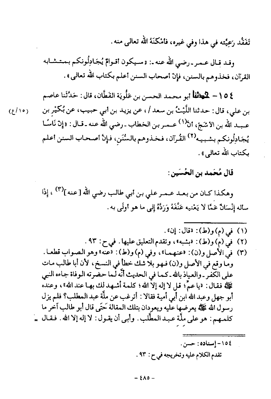 154 - حَدَّثَنَا أَبُو مُحَمَّدٍ الْحَسَنُ بْنُ عَلُّويَةَ الْقَطَّانُ قَالَ: حَدَّثَنَا عَاصِمُ بْنُ عَلِيٍّ قَالَ: حَدَّثَنَا اللَّيْثُ بْنُ سَعْدٍ، عَنْ يَزِيدَ بْنِ أَبِي حَبِيبٍ، عَنْ بُكَيْرِ بْنِ عَبْدِ اللَّهِ بْنِ الْأَشَجِّ قَالَ: إِنَّ عُمَرَ بْنَ الْخَطَّابِ رَضِيَ اللَّهُ عَنْهُ قَالَ: §إِنَّ نَاسًا يُجَادِلُونَكُمْ بِشِبْهِ الْقُرْآنِ، فَخُذُوهُمْ بِالسُّنَنِ، فَإِنَّ أَصْحَابَ السُّنَنِ أَعْلَمُ بِكِتَابِ اللَّهِ تَعَالَى قَالَ مُحَمَّدُ بْنُ الْحُسَيْنِ رَحِمَهُ اللَّهُ: وَهَكَذَا كَانَ مَنْ بَعْدِ عُمَرَ، عَلِيُّ بْنُ أَبِي طَالِبٍ رَضِيَ اللَّهُ عَنْهُمَا، إِذَا سَأَلَهُ إِنْسَانٌ عَمَّا لَا يَعْنِيهِ عَنَّفَهُ وَرَدَّهُ إِلَى مَا هُوَ أَوْلَى بِهِ -[486]- رُوِيَ أَنَّ عَلِيَّ بْنَ أَبِي طَالِبٍ كَرَّمَ اللَّهُ وَجْهَهُ قَالَ يَوْمًا: سَلُونِي، فَقَامَ ابْنُ الْكَوَّاءِ فَقَالَ: مَا السَّوَادُ الَّذِي فِي الْقَمَرِ؟ فَقَالَ لَهُ: قَاتَلَكَ اللَّهُ، سَلْ تَفَقُّهًا، وَلَا تَسْأَلْ تَعَنُّتًا، أَلَا سَأَلْتَ عَنْ شَيْءٍ يَنْفَعُكَ فِي أَمْرِ دُنْيَاكَ أَوْ أَمْرِ آخِرَتِكَ؟ ثُمَّ قَالَ: ذَلِكَ مَحْوُ اللَّيْلِ قُلْتُ: وَقَدْ كَانَ الْعُلَمَاءُ قَدِيمًا وَحَدِيثًا يَكْرَهُونَ عُضْلَ الْمَسَائِلِ وَيَرُدُّونَهَا، وَيَأْمُرُونَ بِالسُّؤَالِ عَمَّا يَعْنِي خَوْفًا مِنَ الْمِرَاءِ وَالْجِدَالِ الَّذِي نُهُوا -[487]- عَنْهُ نَهَى النَّبِيُّ صَلَّى اللهُ عَلَيْهِ وَسَلَّمَ عَنْ قِيلَ وَقَالَ، وَكَثْرَةِ السُّؤَالِ وَنَهَى عَنِ الْأُغْلُوطَاتِ وَقَالَ النَّبِيُّ صَلَّى اللهُ عَلَيْهِ وَسَلَّمَ: «أَعْظَمُ الْمُسْلِمِينَ فِي الْمُسْلِمِينَ جُرْمًا مَنْ سَأَلَ عَنْ شَيْءٍ لَمْ يُحَرَّمْ، فَحُرِّمَ مِنْ أَجْلِ مَسْأَلَتِهِ» كُلُّ هَذَا خَوْفًا مِنَ الْمِرَاءِ وَالْجِدَالِ، فَاتَّقُوا اللَّهَ يَا أَهْلَ الْقُرْآنِ , وَيَا أَهْلَ الْحَدِيثِ , وَيَا أَهْلَ الْفِقْهِ , وَدَعُوا الْمِرَاءَ وَالْجِدَالَ وَالْخُصُومَةَ فِي الدِّينِ وَاسْلُكُوا طَرِيقَ مَنْ سَلَفَ مِنْ -[488]- أَئِمَّتِكُمْ، يَسْتَقِمْ لَكُمُ الْأَمْرُ الرَّشِيدُ، وَتَكُونُوا عَلَى الْمَحَجَّةِ الْوَاضِحَةِ إِن ْشَاءَ اللَّهُ تَعَالَى، فَقَدْ أُثْبِتَ فِي تَرْكِ الْمِرَاءِ وَالْجِدَالِ مَا فِيهِ كِفَايَةٌ لِمَنْ عَقَلَ، وَاللَّهُ الْمُوَفِّقُ لِمَنْ أَحَبَّ