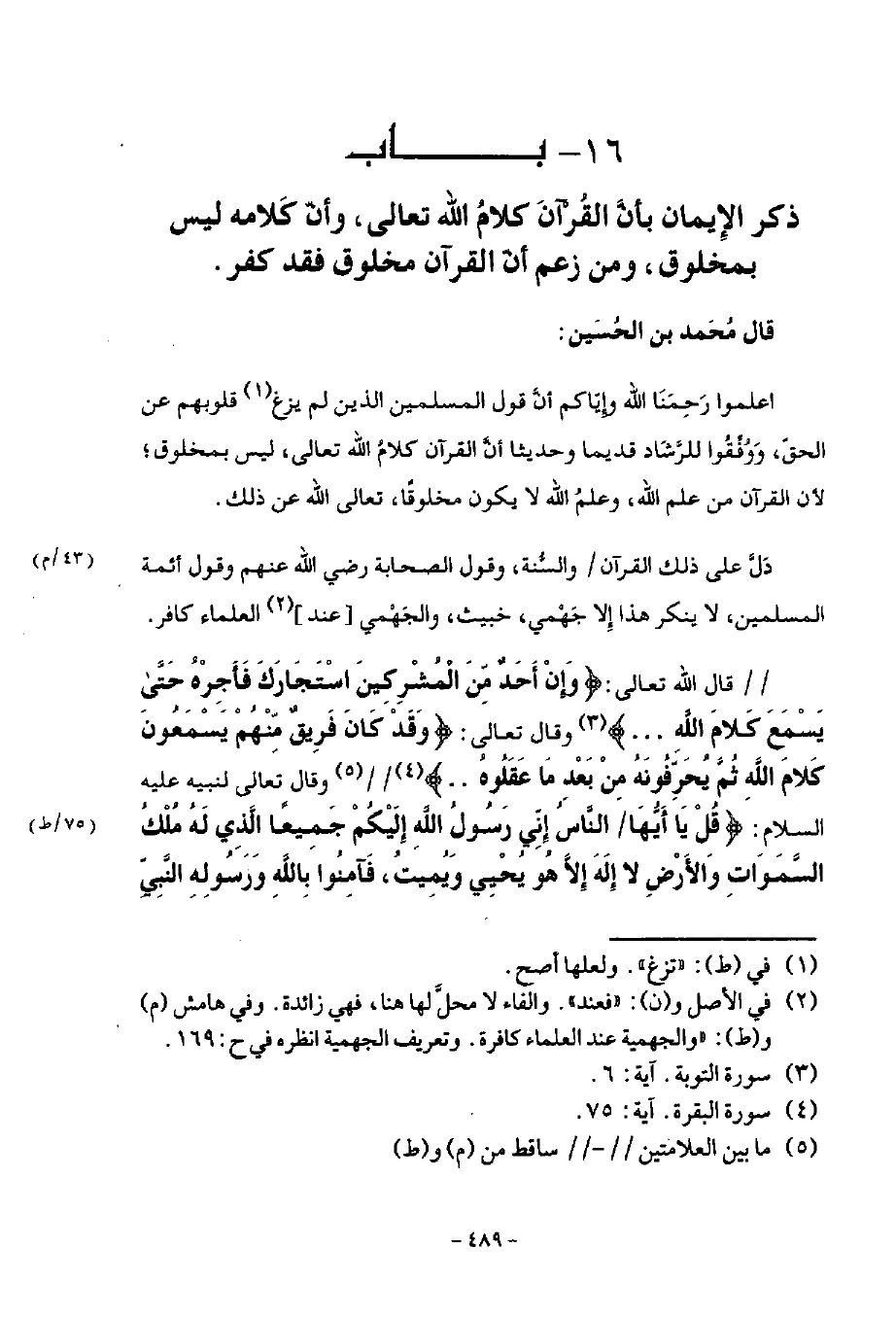 §بَابُ ذِكْرِ الْإِيمَانِ بِأَنَّ الْقُرْآنَ كَلَامُ اللَّهِ تَعَالَى، وَأَنَّ كَلَامَهُ لَيْسَ بِمَخْلُوقٍ وَمَنْ زَعَمَ أَنَّ الْقُرْآنَ مَخْلُوقٌ فَقَدْ كَفَرَ قَالَ مُحَمَّدُ بْنُ الْحُسَيْنِ: اعْلَمُوا رَحِمَنَا اللَّهُ وَإِيَّاكُمْ أَنَّ قَوْلَ الْمُسْلِمِينَ الَّذِينَ لَمْ يُزِغْ قُلُوبَهُمْ عَنِ الْحَقِّ، وُوُفِّقُوا لِلرَّشَادِ قَدِيمًا وَحَدِيثًا أَنَّ الْقُرْآنَ كَلَامُ اللَّهِ تَعَالَى لَيْسَ بِمَخْلُوقٍ؛ لِأَنَّ الْقُرْآنَ مِنْ عِلْمِ اللَّهِ، وَعِلْمُ اللَّهِ لَا يَكُونُ مَخْلُوقًا، تَعَالَى اللَّهُ عَنْ ذَلِكَ دَلَّ عَلَى ذَلِكَ الْقُرْآنُ وَالسُّنَّةُ، وَقَوْلُ الصَّحَابَةِ رَضِيَ اللَّهُ عَنْهُمْ وَقَوْلُ أَئِمَّةِ الْمُسْلِمِينَ لَا يُنْكِرُ هَذَا إِلَّا جَهْمِيٌّ خَبِيثٌ، وَالْجَهْمِيُّ فَعِنْدَ الْعُلَمَاءِ كَافِرٌ قَالَ اللَّهُ تَعَالَى: {وَإِنْ أَحَدٌ مِنَ الْمُشْرِكِينَ اسْتَجَارَكَ فَأَجِرْهُ حَتَّى يَسْمَعَ كَلَامَ اللَّهِ} [التوبة: 6] ، وَقَالَ تَعَالَى: {وَقَدْ كَانَ فَرِيقٌ مِنْهُمْ يَسْمَعُونَ كَلَامَ اللَّهِ ثُمَّ يُحَرِّفُونَهُ مِنْ بَعْدِ مَا عَقَلُوهُ} [البقرة: 75] وَقَالَ تَعَالَى لِنَبِيِّهِ عَلَيْهِ السَّلَامُ {قُلْ يَا أَيُّهَا النَّاسُ إِنِّي رَسُولُ اللَّهِ إِلَيْكُمْ جَمِيعًا الَّذِي لَهُ مُلْكُ السَّمَوَاتِ وَالْأَرْضِ لَا إِلَهَ إِلَّا هُوَ يُحْيِي وَيُمِيتُ، فَآمِنُوا بِاللَّهِ وَرَسُولِهِ النَّبِيِّ