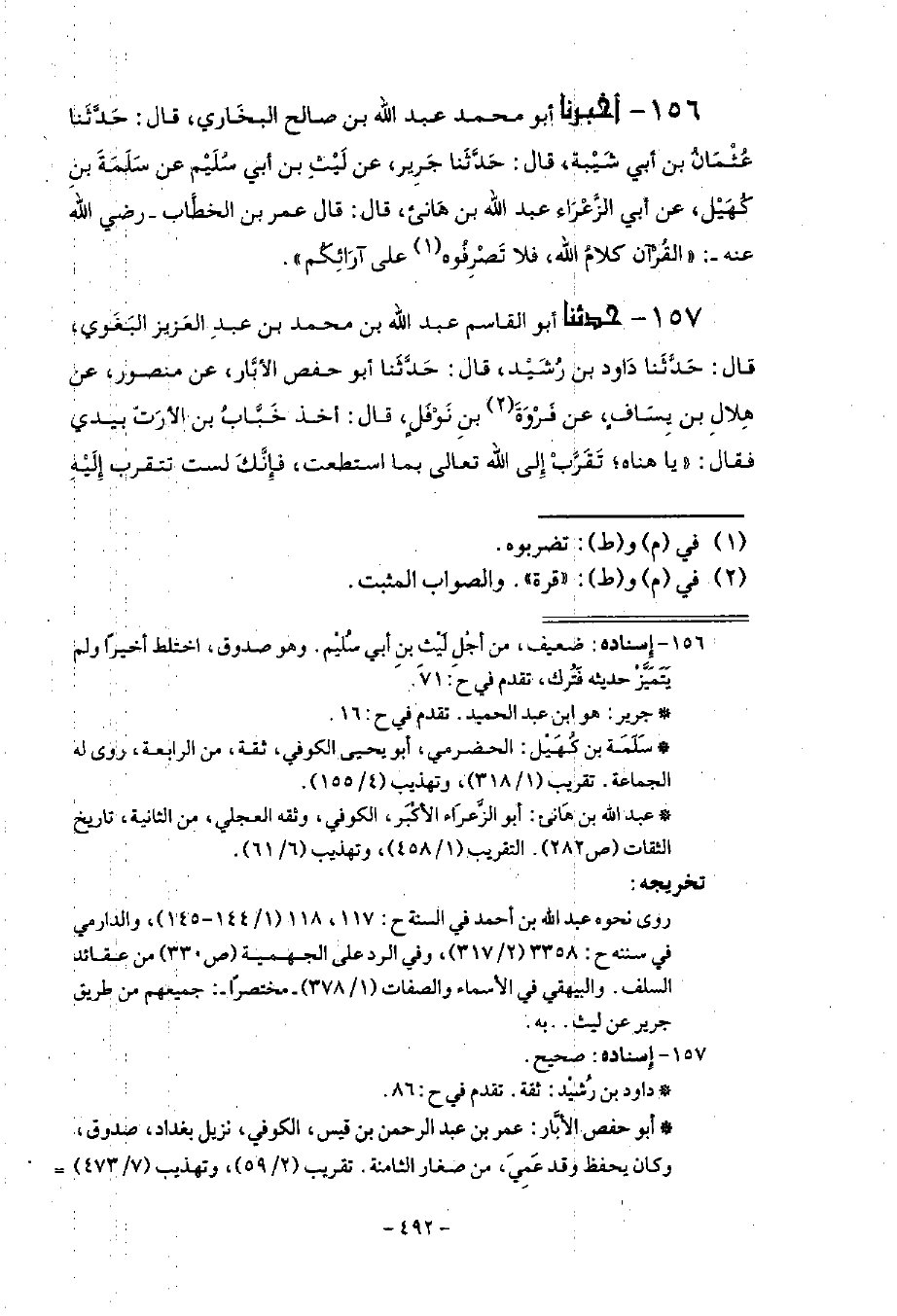 156 - أَخْبَرَنَا أَبُو مُحَمَّدٍ عَبْدُ اللَّهِ بْنُ صَالِحٍ الْبُخَارِيُّ قَالَ: حَدَّثَنَا عُثْمَانُ بْنُ أَبِي شَيْبَةَ قَالَ: حَدَّثَنَا جَرِيرٌ، عَنْ لَيْثِ بْنِ أَبِي سُلَيْمٍ، عَنْ سَلَمَةَ بْنِ كُهَيْلٍ، عَنْ أَبِي الزَّعْرَاءِ عَبْدِ اللَّهِ بْنِ هَانِئٍ قَالَ: قَالَ عُمَرُ بْنُ الْخَطَّابِ رَضِيَ اللَّهُ عَنْهُ: §الْقُرْآنُ كَلَامُ اللَّهِ فَلَا تَصْرِفُوهُ عَلَى آرَائِكُمْ
