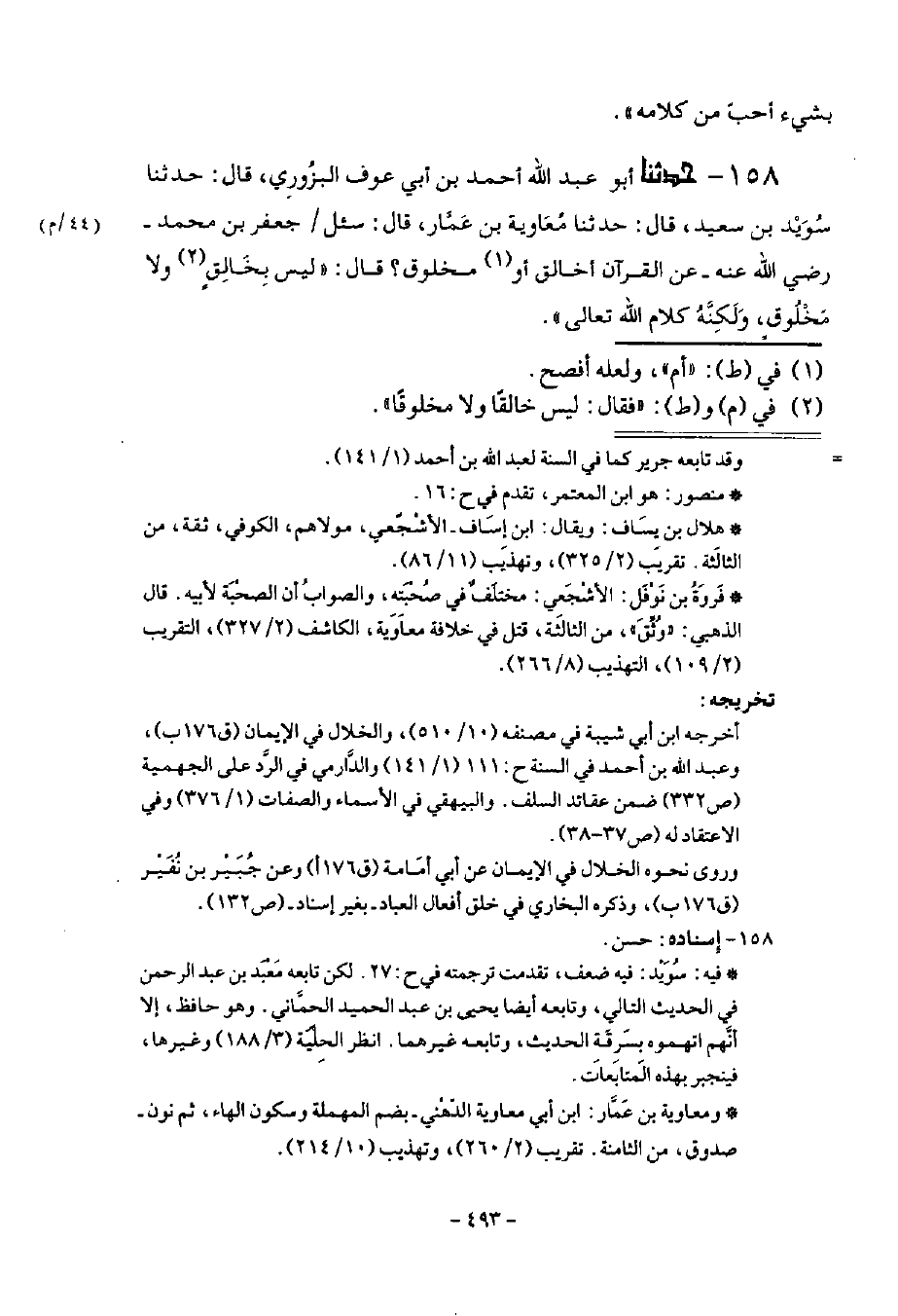 158 - حَدَّثَنَا أَبُو عَبْدِ اللَّهِ أَحْمَدُ بْنُ أَبِي عَوْفٍ الْبَزْوَرِيُّ قَالَ: حَدَّثَنَا سُوَيْدُ بْنُ سَعِيدٍ قَالَ: حَدَّثَنَا مُعَاوِيَةُ بْنُ عَمَّارٍ قَالَ: سُئِلَ جَعْفَرُ بْنُ مُحَمَّدٍ رَضِيَ اللَّهُ عَنْهُمَا عَنِ الْقُرْآنِ، أَخَالِقٌ أَوْ مَخْلُوقٌ؟ قال: «§لَيْسَ خَالِقًا وَلَا مَخْلُوقًا، وَلَكِنَّهُ كَلَامُ اللَّهِ تَعَالَى»