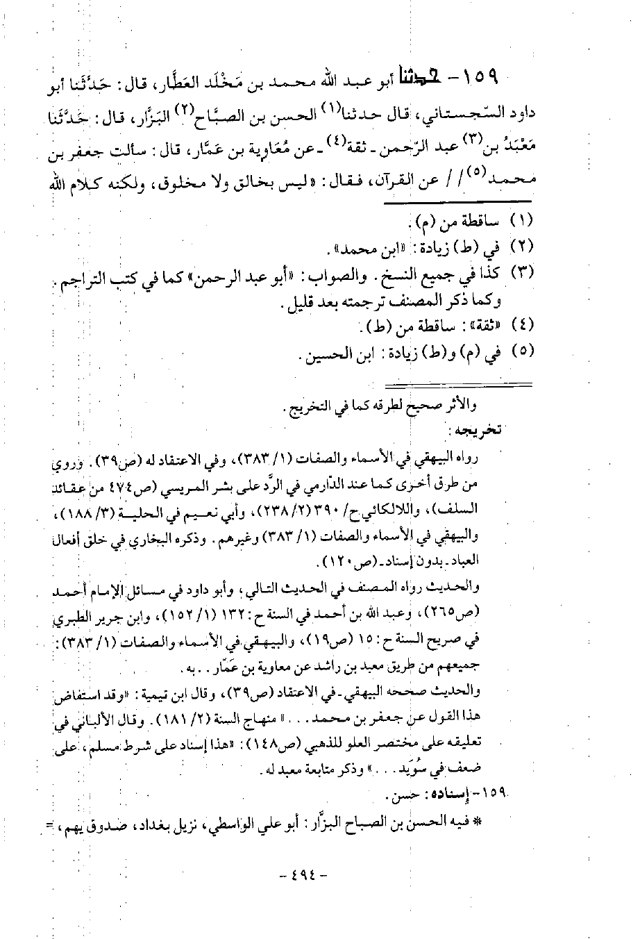 159 - حَدَّثَنَا أَبُو عَبْدِ اللَّهِ مُحَمَّدُ بْنُ مَخْلَدٍ الْعَطَّارُ قَالَ: حَدَّثَنَا أَبُو دَاوُدَ السِّجِسْتَانِيُّ قَالَ: حَدَّثَنَا الْحَسَنُ بْنُ الصَّبَّاحِ الْبَزَّارُ قَالَ: حَدَّثَنَا مَعْبَدُ أَبُو عَبْدِ الرَّحْمَنِ ثِقَةٌ , عَنْ مُعَاوِيَةَ بْنِ عَمَّارٍ قَالَ: سَأَلْتُ جَعْفَرَ بْنَ مُحَمَّدِ بْنِ حُسَيْنٍ عَنِ الْقُرْآنِ؟ فَقَالَ: §لَيْسَ بِخَالِقٍ وَلَا مَخْلُوقٍ , وَلَكِنَّهُ كَلَامُ اللَّهِ -[495]- تَعَالَى وَهُوَ مَعْبَدُ بْنُ رَاشِدٍ كُوفِيُّ رَوَى عَنْ مُوسَى بنِ دَاوُدَ وَرُوَيْمِ بْنِ يَزِيدَ