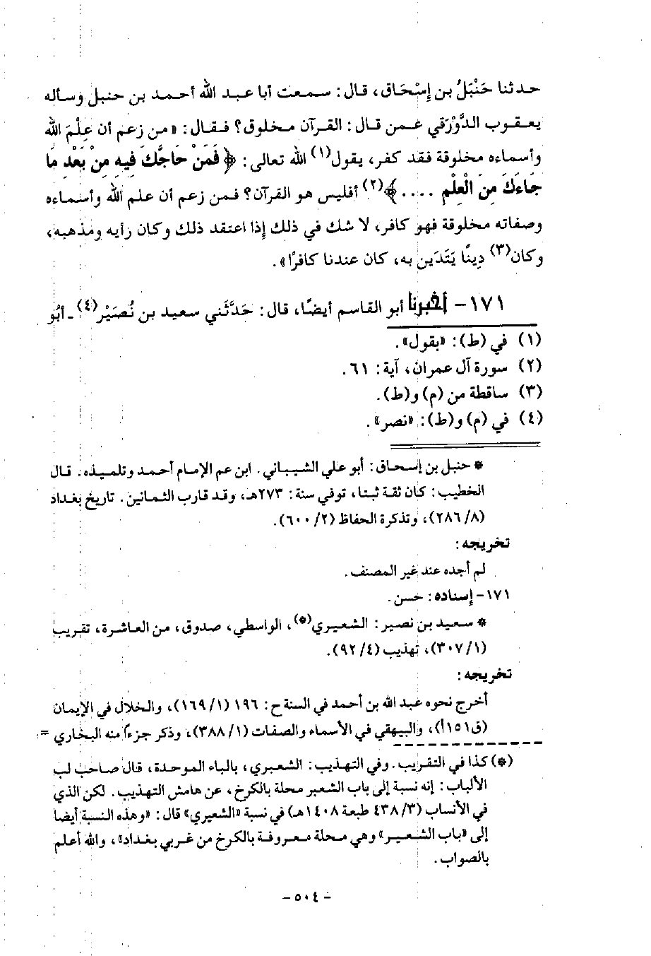 171 - أَخْبَرَنَا أَبُو الْقَاسِمِ أَيْضًا قَالَ: حَدَّثَنِي سَعِيدُ بْنُ نُصَيْرٍ أَبُو -[505]- عُثْمَانَ الْوَاسِطِيُّ فِي مَجْلِسِ خَلَفِ الْبَزَّارِ قَالَ: سَمِعْتُ ابْنَ عُيَيْنَةَ يَقُولُ: مَا يَقُولُ هَذِهِ الدُّوَيْبَةُ؟ يَعْنِي بِشْرًا الْمِرِّيسِيُّ قَالُوا: يَا أَبَا مُحَمَّدٍ يَزْعُمُ أَنَّ الْقُرْآنَ مَخْلُوقٌ فَقَالَ: كَذَبَ قَالَ اللَّهُ تَعَالَى: {§أَلَا لَهُ الْخَلْقُ وَالْأَمْرُ} [الأعراف: 54] فَالْخَلْقُ: خَلْقُ اللَّهِ، وَالْأَمْرُ: الْقُرْآنُ