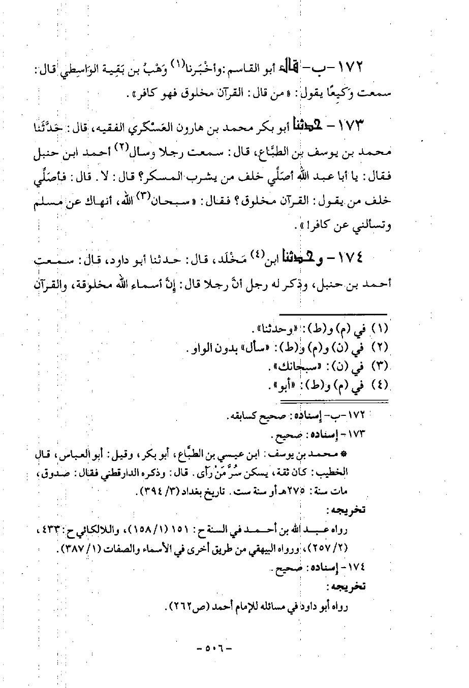174 - أَخْبَرَنَا ابْنُ مَخْلَدٍ قَالَ: حَدَّثَنَا أَبُو دَاوُدَ قَالَ سَمِعْتُ أَحْمَدَ بْنَ حَنْبَلٍ، وَذُكِرَ لَهُ رَجُلٌ أَنَّ رَجُلًا قَالَ: إِنَّ أَسْمَاءَ اللَّهِ مَخْلُوقَةٌ وَالْقُرْآنَ مَخْلُوقٌ فَقَالَ أَحْمَدُ: كُفْرٌ بَيِّنٌ، قُلْتُ لِأَحْمَدَ: §مَنْ قَالَ: الْقُرْآنُ مَخْلُوقٌ فَهُوَ كَافِرٌ؟ قَالَ: أَقُولُ: هُوَ كَافِرٌ