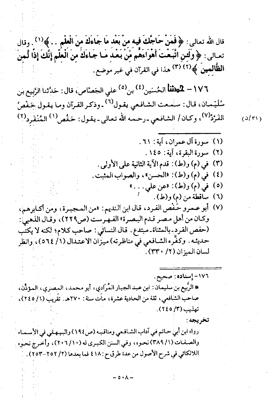 176 - حَدَّثَنَا الْحَسَنُ بْنُ عَلِيٍّ الْجَصَّاصُ قَالَ: حَدَّثَنَا الرَّبِيعُ بْنُ سُلَيْمَانَ قَالَ: سَمِعْتُ الشَّافِعِيَّ يَقُولُ وَذَكَرَ الْقُرْآنَ وَمَا يَقُولُ حَفْصٌ الْفَرْدُ، وَكَانَ الشَّافِعِيُّ يَقُولُ: حَفْصٌ الْمُنْفَرِدُ، وَنَاظَرَهُ بِحَضْرَةِ وَالٍ كَانَ بِمِصْرَ فَقَالَ لَهُ الشَّافِعِيُّ رَضِي اللَّهُ عَنْهُ فِي الْمُنَاظَرَةِ: كَفَرْتَ وَاللَّهِ الَّذِي لَا إِلَهَ إِلَّا هُوَ، ثُمَّ قَامُوا، فَانْصَرَفُوا، فَسَمِعْتُ حَفْصًا يَقُولُ: أَشَاطَ وَاللَّهِ الَّذِي لَا إِلَهَ إِلَّا هُوَ الشَّافِعِيُّ بِدَمِي قَالَ الرَّبِيعُ: وَسَمِعْتُ الشَّافِعِيَّ رَحِمَهُ اللَّهُ تَعَالَى يَقُولُ: §الْقُرْآنُ كَلَامُ اللَّهِ غَيْرَ مَخْلُوقٍ، وَمَنْ قَالَ: مَخْلُوقٌ فَهُوَ كَافِرٌ