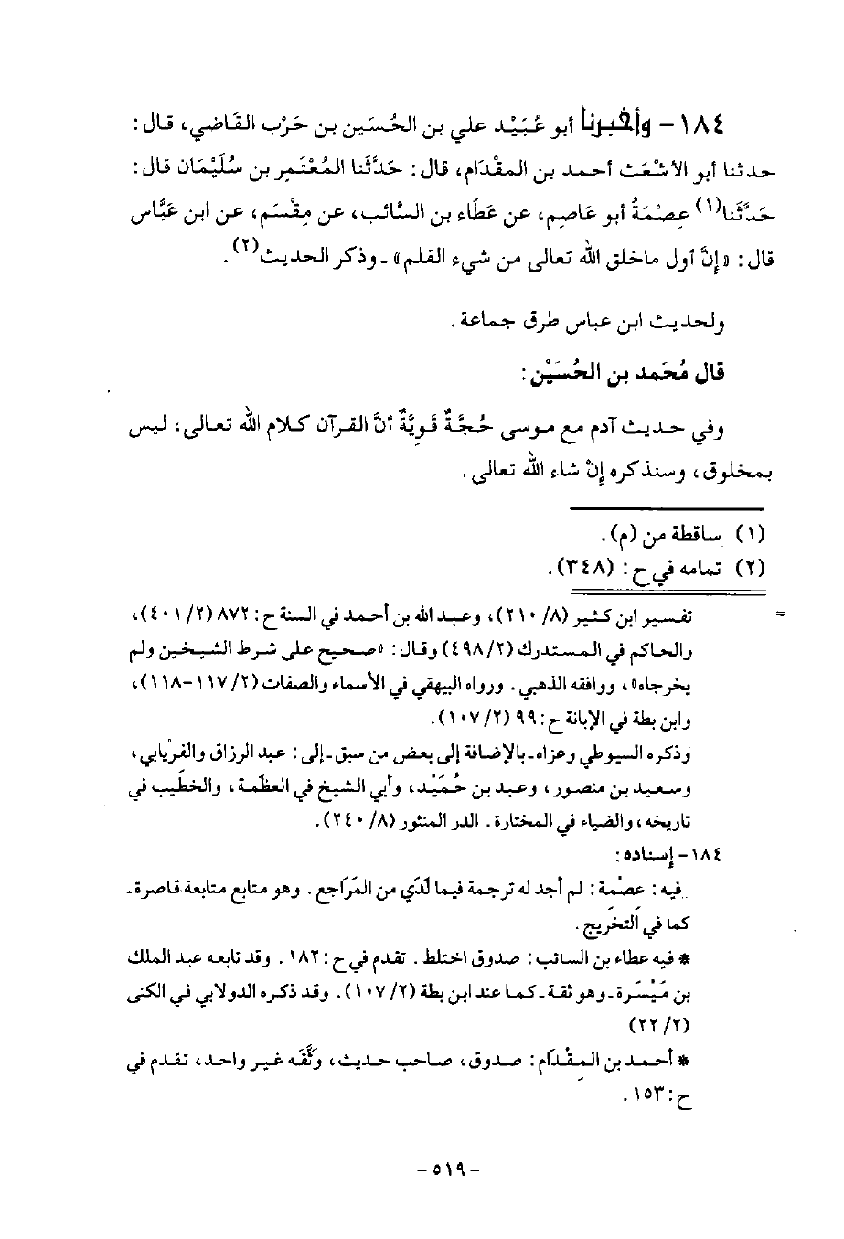 184 - وَأَخْبَرَنَا أَبُو عُبَيْدٍ عَلِيُّ بْنُ الْحُسَيْنِ بْنِ حَرْبٍ الْقَاضِي قَالَ: حَدَّثَنَا أَبُو الْأَشْعَثِ أَحْمَدُ بْنُ الْمِقْدَامِ قَالَ: حَدَّثَنَا الْمُعْتَمِرُ بْنُ سُلَيْمَانَ قَالَ: حَدَّثَنَا عِصْمَةُ أَبُو عَاصِمٍ، عَنْ عَطَاءِ بْنِ السَّائِبِ، عَنْ مِقْسَمٍ، عَنِ ابْنِ عَبَّاسٍ قَالَ: «§إِنَّ أَوَّلَ مَا خَلَقَ اللَّهُ تَعَالَى مِنْ شَيْءٍ الْقَلَمُ. . .» وَذَكَرَ الْحَدِيثَ وَلِحَدِيثِ ابْنِ عَبَّاسٍ رَضِيَ اللَّهُ عَنْهُمَا طُرُقُ جَمَاعَةٍ قَالَ مُحَمَّدُ بْنُ الْحُسَيْنِ: وَفِي حَدِيثِ آدَمَ مَعَ مُوسَى عَلَيْهِمَا السَّلَامُ حُجَّةٌ قَوِيَّةٌ أَنَّ الْقُرْآنَ كَلَامُ اللَّهِ تَعَالَى، لَيْسَ بِمَخْلُوقٍ، وَسَنَذْكُرُهُ إِنْ شَاءَ اللَّهُ تَعَالَى