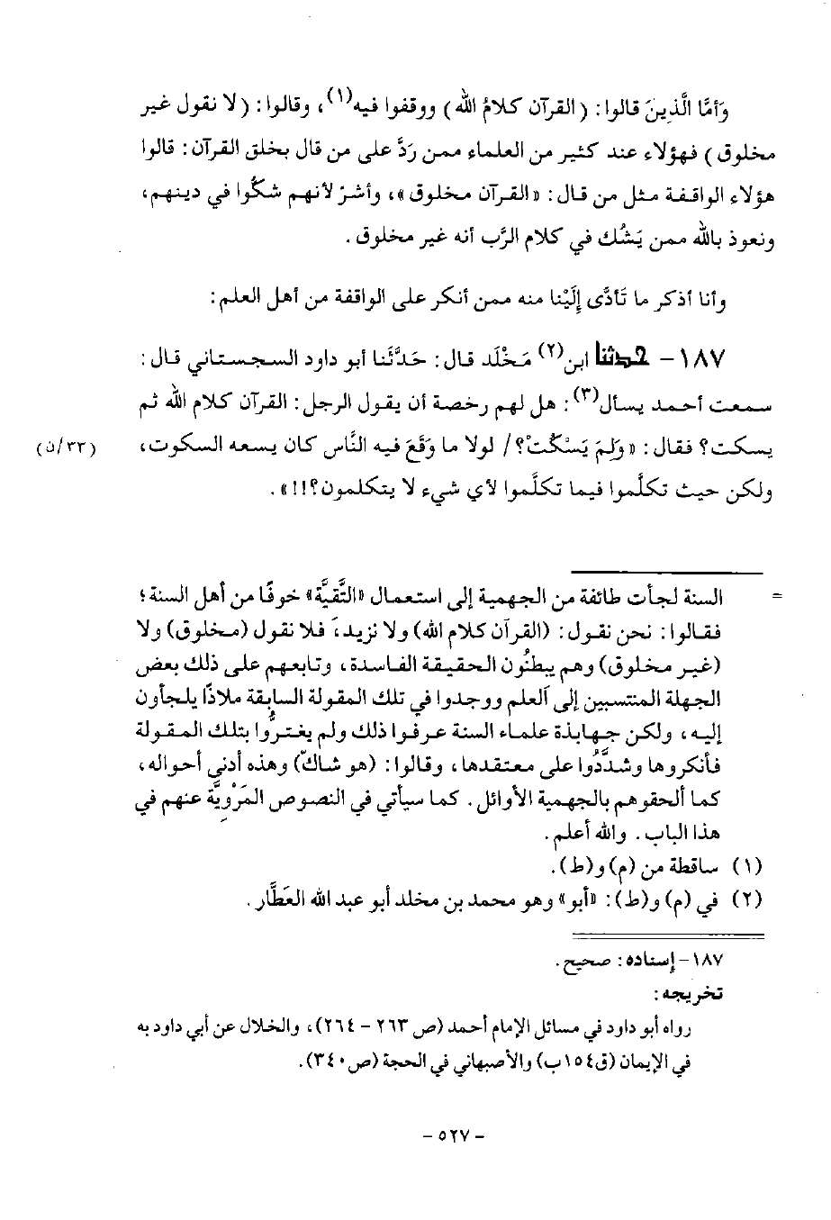 187 - حَدَّثَنَا ابْنُ مَخْلَدٍ قَالَ: حَدَّثَنَا أَبُو دَاوُدَ السِّجِسْتَانِيُّ قَالَ: سَمِعْتُ أَحْمَدَ يَسْأَلُ: §هَلْ لَهُمْ رُخْصَةٌ أَنْ يَقُولَ الرَّجُلُ: الْقُرْآنُ كَلَامُ اللَّهِ، ثُمَّ يَسْكُتُ؟ فَقَالَ: وَلَمْ يَسْكُتْ؟ لَوْلَا مَا وَقَعَ فِيهِ النَّاسُ كَانَ يَسَعُهُ السُّكُوتُ، وَلَكِنْ حَيْثُ تَكَلَّمُوا فِيمَا تَكَلَّمُوا، لِأَيِّ شَيْءٍ لَا يَتَكَلَّمُونَ؟ -[528]- قَالَ مُحَمَّدُ بْنُ الْحُسَيْنِ: مَعْنَى قَوْلِ أَحْمَدَ بْنِ حَنْبَلٍ فِي هَذَا الْمَعْنَى يَقُولُ: لَمْ يَخْتَلِفْ أَهْلُ الْإِيمَانِ أَنَّ الْقُرْآنَ كَلَامُ اللَّهِ تَعَالَى؟ فَلَمَّا جَاءَ جَهْمُ بْنُ صَفْوَانَ فَأَحْدَثَ الْكُفْرَ بِقَوْلِهِ: الْقُرْآنُ مَخْلُوقٌ لَمْ يَسَعِ الْعُلَمَاءَ إِلَّا الرَّدُّ عَلَيْهِ بِأَنَّ الْقُرْآنَ كَلَامُ اللَّهِ غَيْرَ مَخْلُوقٍ بِلَا شَكٍّ، وَلَا تَوَقُّفٍ فِيهِ، فَمَنْ لَمْ يَقُلْ غَيْرَ مَخْلُوقٍ سُمِّيَ وَاقِفِيًّا، شَاكًّا فِي دِينِهِ