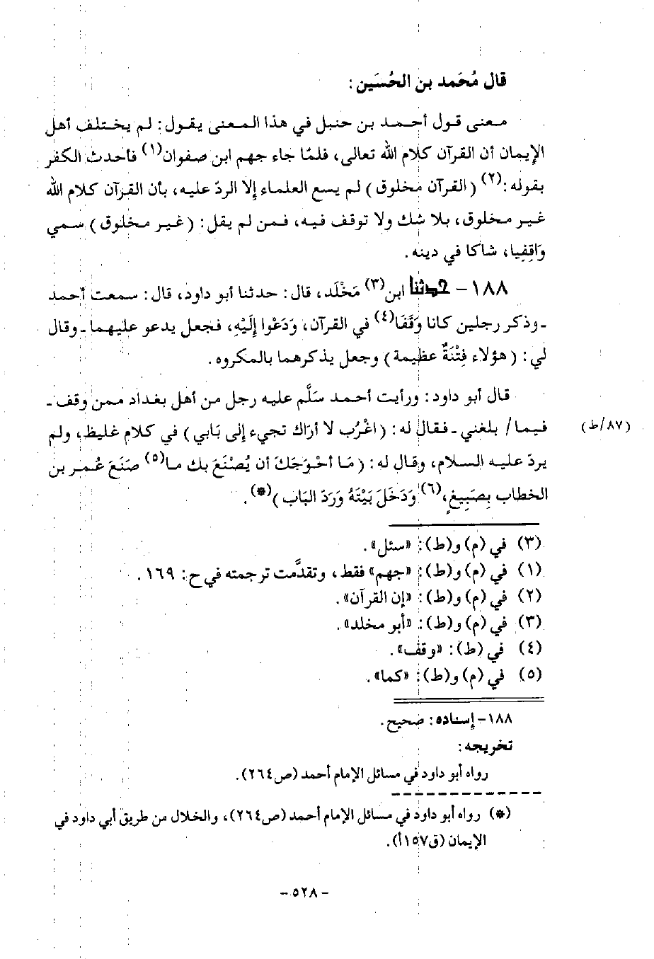 188 - وَحَدَّثَنَا ابْنُ مَخْلَدٍ قَالَ: حَدَّثَنَا أَبُو دَاوُدَ قَالَ: سَمِعْتُ أَحْمَدَ: وَذَكَرَ رَجُلَيْنِ كَانَا وَقَّفَا فِي الْقُرْآنِ، وَدَعَوْا إِلَيْهِ فَجَعَلَ يَدْعُو عَلَيْهِمَا وَقَالَ لِي: §هَؤُلَاءِ فِتْنَةٌ عَظِيمَةٌ، وَجَعَلَ يَذْكُرُهُمَا بِالْمَكْرُوهِ قَالَ أَبُو دَاوُدَ: وَرَأَيْتُ أَحْمَدَ سَلَّمَ عَلَيْهِ رَجُلٌ مِنْ أَهْلِ بَغْدَادَ، مِمَّنْ وَقَّفَ فِيمَا بَلَغَنِي، فَقَالَ لَهُ: اغْرُبْ، لَا أَرَاكُ تَجِيءُ إِلَى بَابِي فِي كَلَامٍ غَلِيظٍ، وَلَمْ يَرُدَّ عَلَيْهِ السَّلَامَ وَقَالَ لَهُ: مَا أَحْوَجَكَ أَنْ يَصْنَعَ بِكَ مَا صَنَعَ عُمَرُ بْنُ الْخَطَّابِ بِصُبَيْغٍ وَدَخَلَ بَيْتَهُ وَرَدَّ الْبَابَ