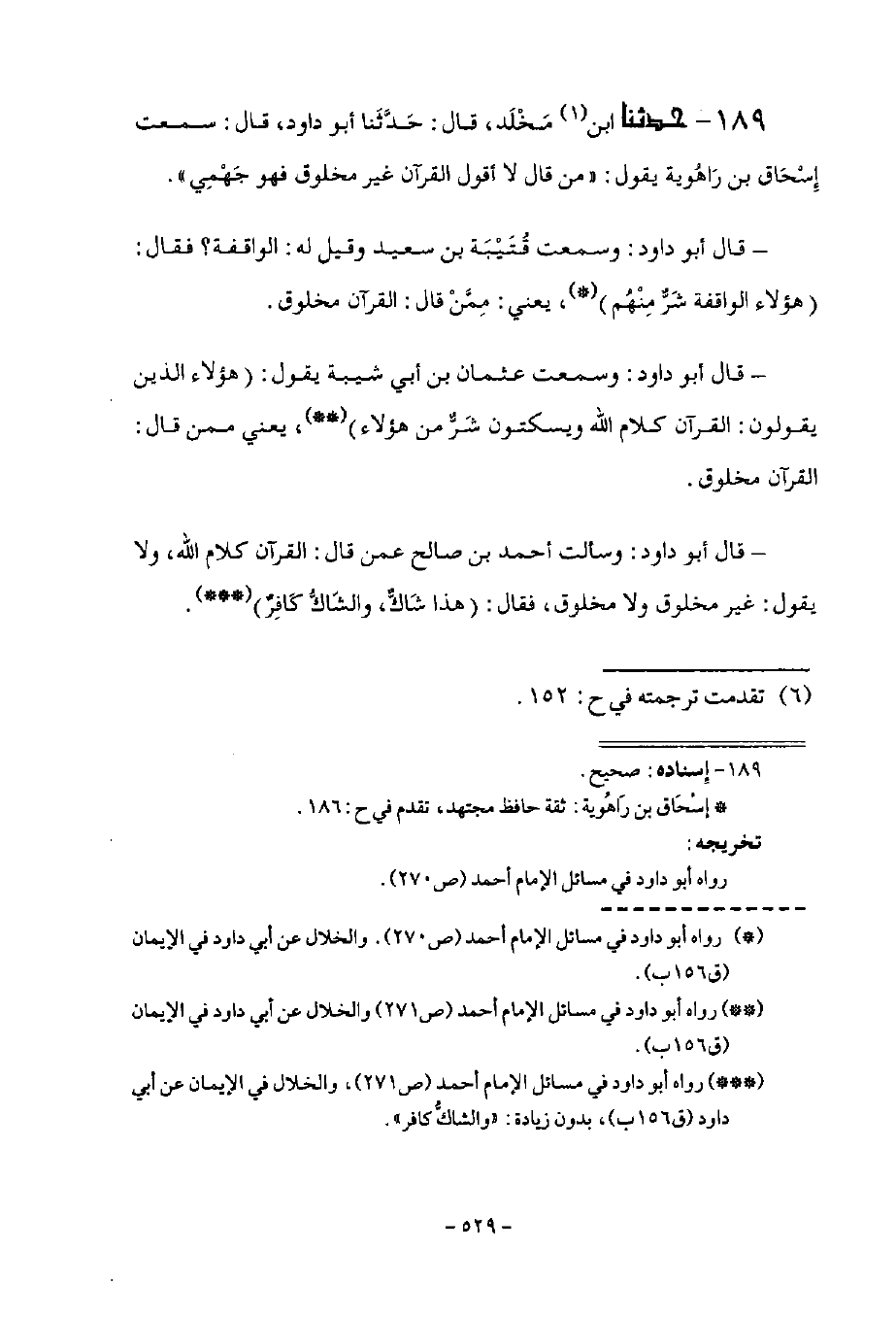 189 - حَدَّثَنَا ابْنُ مَخْلَدٍ قَالَ: حَدَّثَنَا أَبُو دَاوُدَ قَالَ: سَمِعْتُ إِسْحَاقَ بْنَ رَاهَوَيْهِ يَقُولُ: §مَنْ قَالَ لَا أَقُولُ الْقُرْآنُ غَيْرُ مَخْلُوقٍ فَهُوَ جَهْمِيٌّ