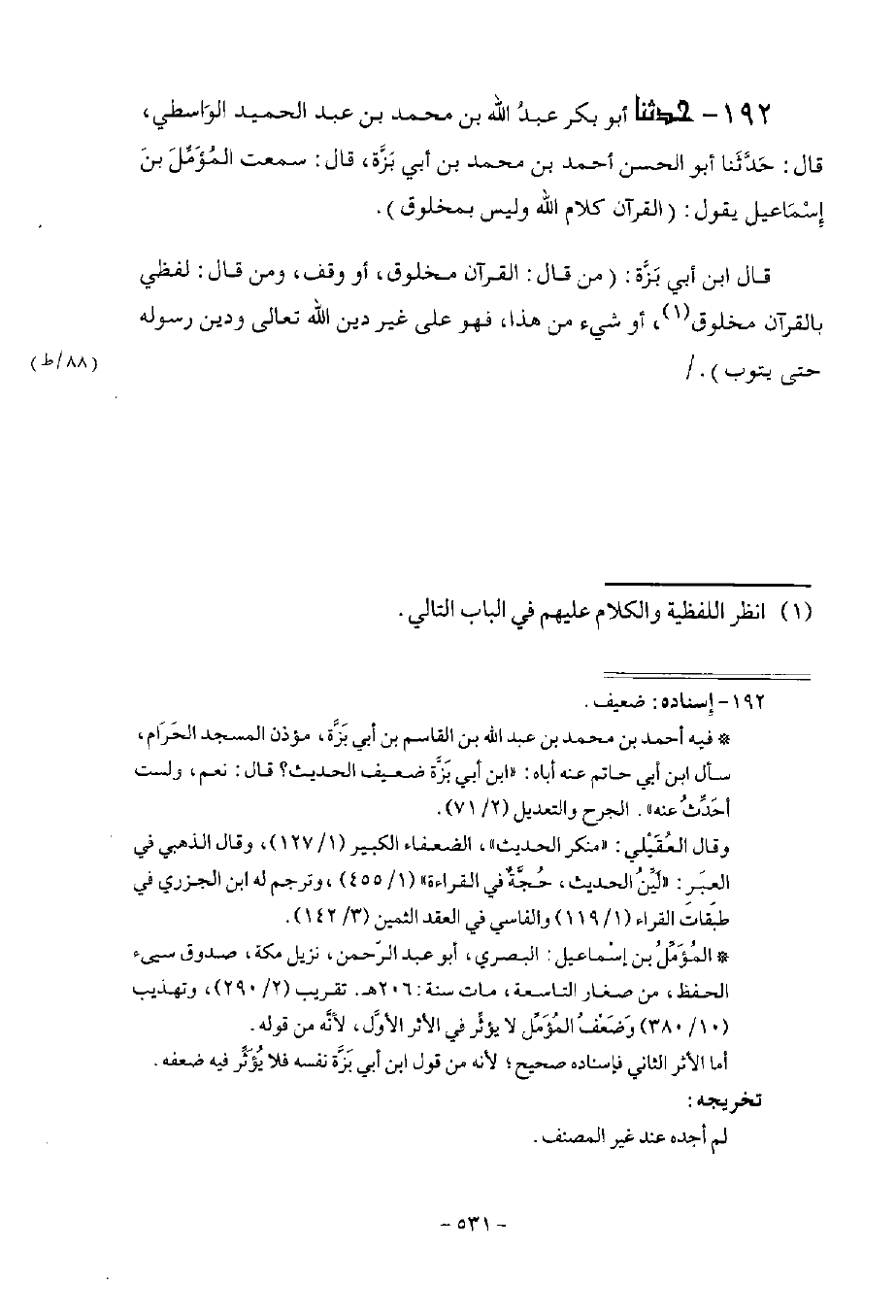 192 - حَدَّثَنَا أَبُو بَكْرٍ عَبْدُ اللَّهِ بْنُ مُحَمَّدِ بْنِ عَبْدِ الْحَمِيدِ الْوَاسِطِيُّ قَالَ: حَدَّثَنَا أَبُو الْحَسَنِ أَحْمَدُ بْنُ مُحَمَّدِ بْنِ أَبِي بَزَّةَ قَالَ: سَمِعْتُ الْمُؤَمَّلَ بْنَ إِسْمَاعِيلَ يَقُولُ: §الْقُرْآنُ كَلَامُ اللَّهِ، وَلَيْسَ بِمَخْلُوقٍ قَالَ ابْنُ أَبِي بَزَّةَ: مَنْ قَالَ: الْقُرْآنُ مَخْلُوقٌ، أَوْ وَقَفَ، وَمَنْ قَالَ: لَفْظِي بِالْقُرْآنِ مَخْلُوقٌ، أَوْ شَيْءٌ مِنْ هَذَا، فَهُوَ عَلَى غَيْرِ دِينِ اللَّهِ تَعَالَى، وَدِينِ رَسُولِهِ حَتَّى يَتُوبَ
