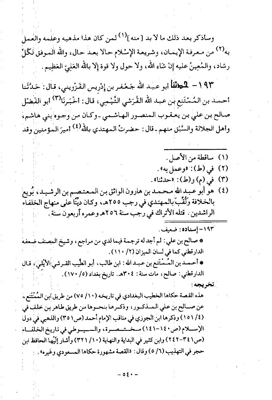 193 - حَدَّثَنَا أَبُو عَبْدِ اللَّهِ جَعْفَرُ بْنُ إِدْرِيسَ الْقَزْوِينِيُّ قَالَ: حَدَّثَنَا أَحْمَدُ بْنُ الْمُمْتَنِعِ بْنِ عُبَيْدِ اللَّهِ الْقُرَشِيُّ التَّيْمِيُّ قَالَ: أنا أَبُو الْفَضْلِ صَالِحُ بْنُ عَلِيِّ بْنِ يَعْقُوبَ بْنِ الْمَنْصُورِ الْهَاشِمِيُّ وَكَانَ مِنْ وُجُوهِ بَنِي هَاشِمٍ وَأَهْلِ الْجَلَالَةِ، وَالشَّأْنِ مِنْهُمْ قَالَ: §حَضَرْتُ الْمُهْتَدِيَ بِاللَّهِ أَمِيرَ الْمُؤْمِنِينَ، وَقَدْ -[541]- جَلَسَ يَنْظُرُ فِي أُمُورِ الْمُسْلِمِينَ فِي دَارِ الْعَامَّةِ، فَنَظَرْتُ إِلَى قِصَصِ النَّاسِ تُقْرَأُ عَلَيْهِ مِنْ أَوَّلِهَا إِلَى آخِرِهَا فَيَأْمُرُ بِالتَّوْقِيعِ فِيهَا وَإِنْشَاءِ الْكُتُبِ لِأَصْحَابِهَا، وَيَخْتِمُ وَيَدْفَعُ إِلَى صَاحِبِهِ، بَيْنَ يَدَيْهِ، فَسَرَّنِي ذَلِكَ، وَجَعَلْتُ أَنْظُرُ إِلَيْهِ، فَفَطِنَ وَنَظَرَ إِلَيَّ، فَغَضَضْتُ عَنْهُ حَتَّى كَانَ ذَلِكَ مِنِّي وَمِنْهُ مِرَارًا ثَلَاثًا، وَإِذَا نَظَرَ غَضَضْتُ، وَإِذَا اشْتَغَلَ نَظَرْتُ، فَقَالَ لِي: يَا صَالِحُ، فَقُلْتُ: لَبَّيْكَ يَا أَمِيرَ الْمُؤْمِنِينَ، فَقُمْتُ قَائِمًا، فَقَالَ: فِي نَفْسِكَ مِنَّا شَيْءٌ يَجِبُ أَنْ تَقُولَهُ؟ أَوْ قَالَ: تُرِيدُ أَنْ تَقُولَهُ؟ فَقُلْتُ: نَعَمْ، يَا سَيِّدِي يَا أَمِيرَ الْمُؤْمِنِينَ قَالَ لِي: عُدْ إِلَى مَوْضِعِكَ، فَعُدْتُ، وَعَادَ فِي النَّظَرِ، حَتَّى إِذَا قَامَ قَالَ لِلْحَاجِبِ: لَا يَبْرَحُ صَالِحٌ، فَانْصَرَفَ النَّاسُ ثُمَّ أَذِنَ لِي، وَقَدْ أَهَمَّتْنِي نَفْسِي فَدَخَلْتُ فَدَعَوْتُ لَهُ، فَقَالَ لِي: اجْلِسْ، فَجَلَسْتُ، فَقَالَ: يَا صَالِحُ، تَقُولُ لِي، مَا دَارَ فِي نَفْسِكَ، أَوْ أَقُولُ أَنَا: مَا دَارَ فِي نَفْسِي أَنَّهُ دَارَ فِي نَفْسِكَ؟ قُلْتُ: يَا أَمِيرَ الْمُؤْمِنِينَ، مَا تَعْزِمُ عَلَيْهِ، وَمَا تَأْمُرُ بِهِ فَقَالَ: وَأَقُولُ: كَأَنِّي بِكَ وَقَدِ اسْتَحْسَنْتَ مَا رَأَيْتَ مِنَّا، فَقُلْتُ: أَيُّ خَلِيفَةٍ خَلِيفَتُنَا، إِنْ لَمْ يَكُنْ يَقُولُ: الْقُرْآنُ مَخْلُوقٌ؟ فَوَرَدَ عَلَى قَلْبِي أَمْرٌ عَظِيمٌ، وَأَهَمَّتْنِي نَفْسِي، ثُمَّ قُلْتُ: يَا نَفْسُ، هَلْ تَمُوتِينَ إِلَّا مَرَّةً؟ وَهَلْ تَمُوتِينَ قَبْلَ أَجَلِكَ؟ وَهَلْ يَجُوزُ الْكَذِبُ فِي جَدٍّ أَوْ هَزْلٍ؟ -[542]- فَقُلْتُ: وَاللَّهِ يَا أَمِيرَ الْمُؤْمِنِينَ، وَمَا دَارَ فِي نَفْسِي إِلَّا مَا قُلْتُ، ثُمَّ أَطْرَقَ مَلِيًّا، ثُمَّ قَالَ لِي: وَيْحَكَ، اسْمَعْ مِنِّي مَا أَقُولُ، فَوَاللَّهِ لَتَسْمَعَنَّ مِنِّي الْحَقَّ، فَسُرِّيَ عَنِّي فَقُلْتُ: يَا سَيِّدِي وَمَنْ أَوْلَى بِقَوْلِ الْحَقِّ مِنْكَ، وَأَنْتَ خَلِيفَةُ رَبِّ الْعَالَمِينَ، وَابْنُ عَمِّ سَيِّدِ الْمُرْسَلِينَ، مِنَ الْأَوَّلِينَ وَالْآخِرِينَ فَقَالَ لِي: مَا زِلْتُ أَقُولُ: إِنَّ الْقُرْآنَ مَخْلُوقٌ صَدْرًا مِنْ خِلَافَةِ الْوَاثِقِ، حَتَّى أَقْدَمَ عَلَيْنَا أَحْمَدُ بْنُ أَبِي دُؤَادٍ شَيْخًا مِنْ أَهْلِ الشَّامِ مِنْ أَهْلِ أَذَنَةَ فَأُدْخِلَ الشَّيْخُ عَلَى الْوَاثِقِ مُقَيَّدًا، وَهُوَ جَمِيلُ الْوَجْهِ تَامُّ الْقَامَةِ -[543]-، حَسَنُ الشَّيْبَةِ، فَرَأَيْتُ الْوَاثِقَ قَدِ اسْتَحْيَى مِنْهُ، وَرَقَّ لَهُ، فَمَا زَالَ يُدْنِيهُ وَيُقَرِّبُهُ، حَتَّى قَرُبَ مِنْهُ، فَسَلَّمَ الشَّيْخُ فَأَحْسَنَ السَّلَامَ، وَدَعَا فَأَبْلَغَ الدُّعَاءَ، وَأَوْجَزَ، فَقَالَ لَهُ الْوَاثِقُ اجْلِسْ ثُمَّ قَالَ لَهُ: يَا شَيْخُ، نَاظِرِ ابْنَ أَبِي دُؤَادٍ عَلَى مَا يُنَاظِرُكَ عَلَيْهِ فَقَالَ الشَّيْخُ: يَا أَمِيرَ الْمُؤْمِنِينَ، ابْنُ أَبِي دُؤَادٍ يَقِلُّ وَيَضِيقُ، وَيَضْعُفُ عَنِ الْمُنَاظَرَةِ فَغَضِبَ الْوَاثِقُ، وَعَادَ مَكَانَ الرَّأْفَةِ لَهُ غَضَب