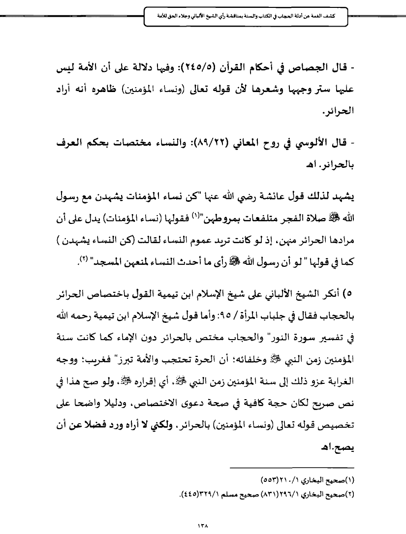 ٥) أنكر الشيخ الألباني على شيخ الإسلام ابن تيمية القول باختصاص الحرائر بالحجاب فقال في جلباب المرأة / ٩٥: وأما قول شيخ الإسلام ابن تيمية رحمه الله في تفسير سورة النور" والحجاب مختص بالحرائر دون الإماء كما كانت سنة المؤمنين زمن النبي - صلى الله عليه وسلم - وخلفائه؛ أن الحرة تحتجب والأمة تبرز" فغريب؛ ووجه الغرابة عزو ذلك إلى سنة المؤمنين زمن النبي - صلى الله عليه وسلم -، أي إقراره - صلى الله عليه وسلم -، ولو صح هذا في نص صريح لكان حجة كافية في صحة دعوى الاختصاص، ودليلا واضحا على تخصيص قوله تعالى (ونساء المؤمنين) بالحرائر، ولكني لا أراه ورد فضلا عن أن يصح. اهـ