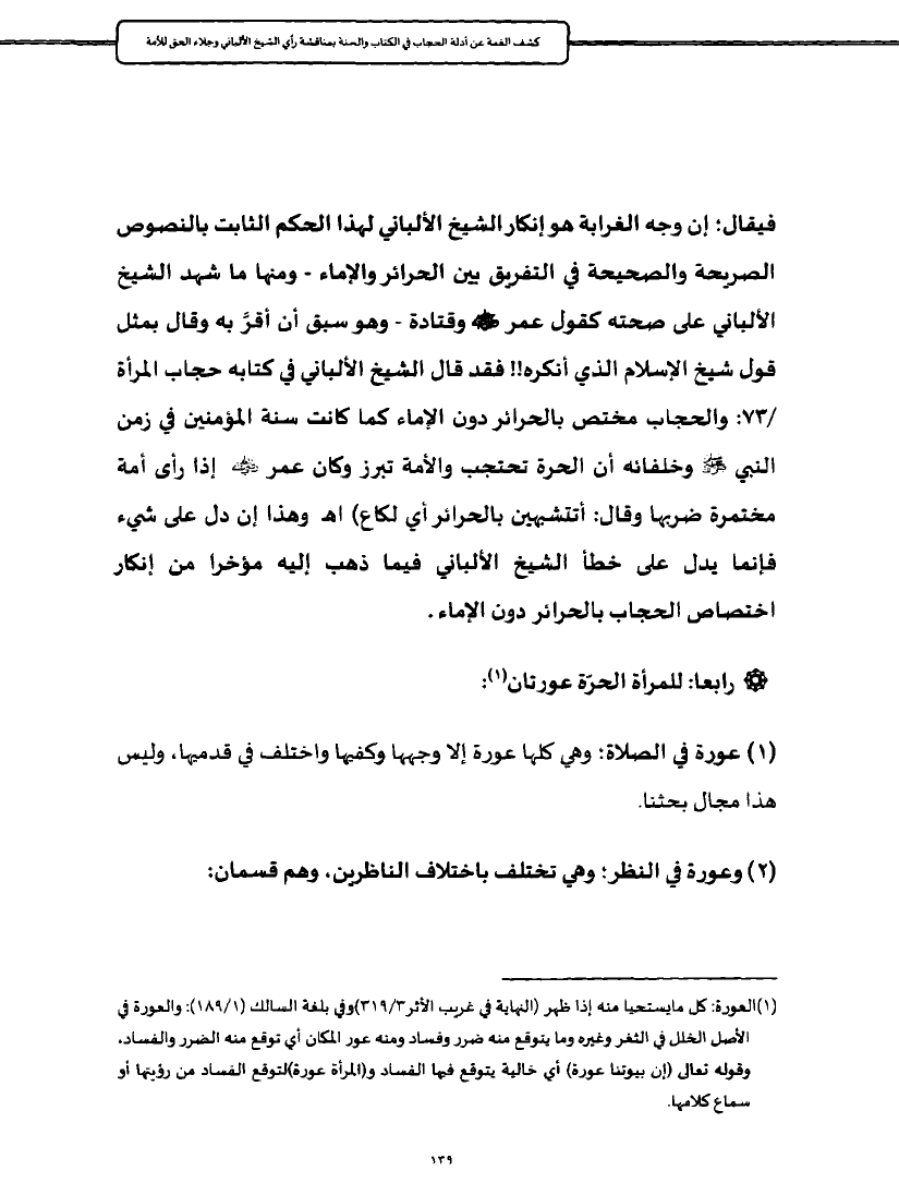 فيقال؛ إن وجه الغرابة هو إنكار الشيخ الألباني لهذا الحكم الثابت بالنصوص الصريحة والصحيحة في التفريق بين الحرائر والإماء - ومنها ما شهد الشيخ الألباني على صحته كقول عمر - رضي الله عنه - وقتادة - وهو سبق أن أقرَّ به وقال بمثل قول شيخ الإسلام الذي أنكره!! فقد قال الشيخ الألباني في كتابه حجاب المرأة /٧٣: والحجاب مختص بالحرائر دون الإماء كما كانت سنة المؤمنين في زمن النبي - صلى الله عليه وسلم - وخلفائه أن الحرة تحتجب والأمة تبرز وكان عمر - رضي الله عنه - إذا رأى أمة مختمرة ضربها وقال: أتتشبهين بالحرائر أي لكاع) اهـ وهذا إن دل على شيء فإنما يدل على خطأ الشيخ الألباني فيما ذهب إليه مؤخرا من إنكار اختصاص الحجاب بالحرائر دون الإماء.