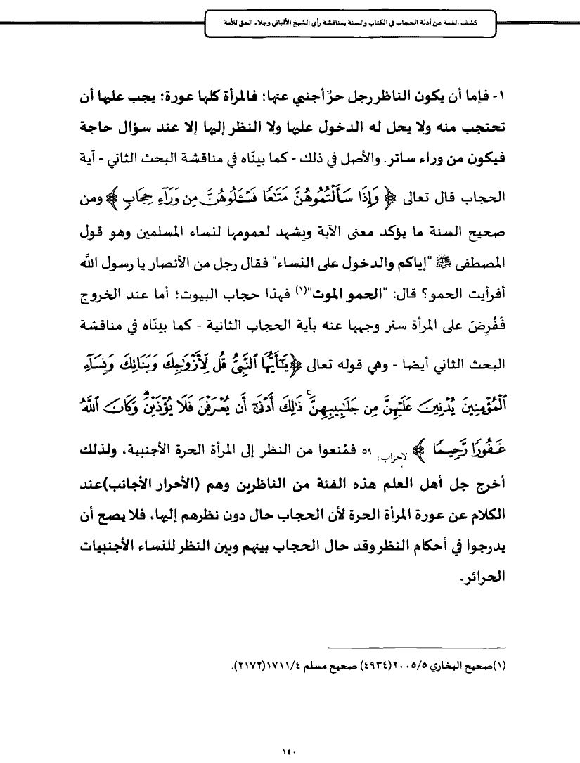 ١ - فإما أن يكون الناظر رجل حرٌ أجنبي عنها؛ فالمرأة كلها عورة؛ يجب عليها أن تحتجب منه ولا يحل له الدخول عليها ولا النظر إليها إلا عند سؤال حاجة فيكون من وراء ساتر. والأصل في ذلك - كما بينّاه في مناقشة البحث الثاني - آية الحجاب قال تعالى {وَإِذَا سَأَلْتُمُوهُنَّ مَتَاعًا فَاسْأَلُوهُنَّ مِنْ وَرَاءِ حِجَابٍ} ومن صحيح السنة ما يؤكد معنى الآية ويشهد لعمومها لنساء المسلمين وهو قول المصطفى - صلى الله عليه وسلم - "إياكم والدخول على النساء" فقال رجل من الأنصار يا رسول اللَّه أفرأيت الحمو؟ قال: "الحمو الموت" (¬١) فهذا حجاب البيوت؛ أما عند الخروج فَفُرِضَ على المرأة ستر وجهها عنه بآية الحجاب الثانية - كما بينّاه في مناقشة البحث الثاني أيضا - وهي قوله تعالى {يَاأَيُّهَا النَّبِيُّ قُلْ لِأَزْوَاجِكَ وَبَنَاتِكَ وَنِسَاءِ الْمُؤْمِنِينَ يُدْنِينَ عَلَيْهِنَّ مِنْ جَلَابِيبِهِنَّ ذَلِكَ أَدْنَى أَنْ يُعْرَفْنَ فَلَا يُؤْذَيْنَ وَكَانَ اللَّهُ غَفُورًا رَحِيمًا} الأحزاب: ٥٩ فمُنعوا من النظر إلى المرأة الحرة الأجنبية، ولذلك أخرج جل أهل العلم هذه الفئة من الناظرين وهم (الأحرار الأجانب) عند الكلام عن عورة المرأة الحرة لأن الحجاب حال دون نظرهم إليها، فلا يصح أن يدرجوا في أحكام النظر وقد حال الحجاب بينهم وبين النظر للنساء الأجنبيات الحرائر.