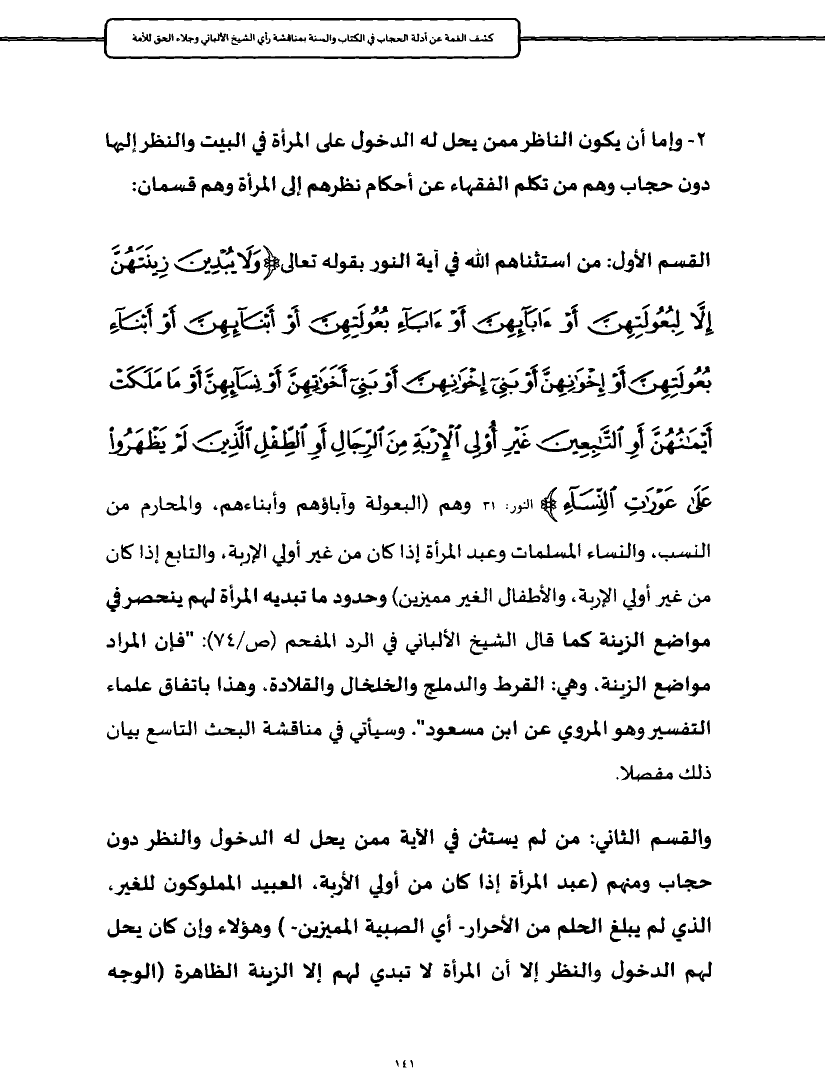 القسم الأول: من استثناهم الله في آية النور بقوله تعالى {وَلَا يُبْدِينَ زِينَتَهُنَّ إِلَّا لِبُعُولَتِهِنَّ أَوْ آبَائِهِنَّ أَوْ آبَاءِ بُعُولَتِهِنَّ أَوْ أَبْنَائِهِنَّ أَوْ أَبْنَاءِ بُعُولَتِهِنَّ أَوْ إِخْوَانِهِنَّ أَوْ بَنِي إِخْوَانِهِنَّ أَوْ بَنِي أَخَوَاتِهِنَّ أَوْ نِسَائِهِنَّ أَوْ مَا مَلَكَتْ أَيْمَانُهُنَّ أَوِ التَّابِعِينَ غَيْرِ أُولِي الْإِرْبَةِ مِنَ الرِّجَالِ أَوِ الطِّفْلِ الَّذِينَ لَمْ يَظْهَرُوا عَلَى عَوْرَاتِ النِّسَاءِ} النور: ٣١ وهم (البعولة وآباؤهم وأبناءهم، والمحارم من النسب، والنساء المسلمات وعبد المرأة إذا كان من غير أولي الإربة، والتابع إذا كان من غير أولي الإربة، والأطفال الغير مميزين) وحدود ما تبديه المرأة لهم ينحصر في مواضع الزينة كما قال الشيخ الألباني في الرد المفحم (ص/٧٤): "فإن المراد مواضع الزينة، وهي: القرط والدملج والخلخال والقلادة، وهذا باتفاق علماء التفسير وهو المروي عن ابن مسعود". وسيأتي في مناقشة البحث التاسع بيان ذلك مفصلا.