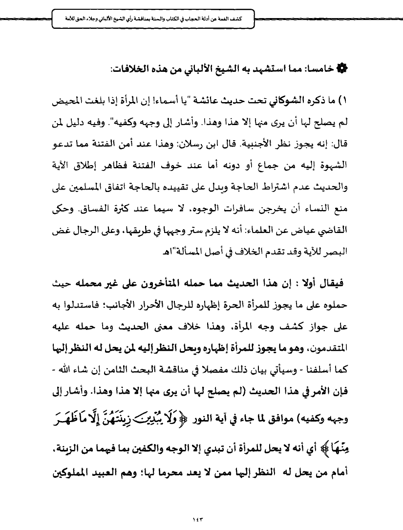 ١) ما ذكره الشوكاني تحت حديث عائشة "يا أسماء! إن المرأة إذا بلغت المحيض لم يصلح لها أن يرى منها إلا هذا وهذا. وأشار إلى وجهه وكفيه". وفيه دليل لمن قال: إنه يجوز نظر الأجنبية. قال ابن رسلان: وهذا عند أمن الفتنة مما تدعو الشهوة إليه من جماع أو دونه أما عند خوف الفتنة فظاهر إطلاق الآية والحديث عدم اشتراط الحاجة ويدل على تقييده بالحاجة اتفاق المسلمين على منع النساء أن يخرجن سافرات الوجوه، لا سيما عند كثرة الفساق. وحكى القاضي عياض عن العلماء: أنه لا يلزم ستر وجهها في طريقها، وعلى الرجال غض البصر للآية وقد تقدم الخلاف في أصل المسألة"اهـ