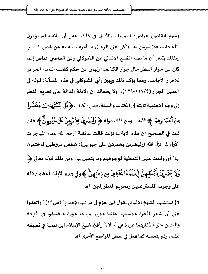 ومنهم القاضي عياض؛ التمسك بالأصل في ذلك، وهو أن الإماء لم يؤمرن بالحجاب، فلا يلزمن به، ولكن على الرجال ما أمرهم الله به من غض البصر. وبذلك يتبين أن ما نقله الشيخ الألباني عن الشوكاني وعن القاضي عياض إنما كان عن جواز النظر حال جواز الكشف؛ وليس عن حكم كشف النساء الحرائر للأحرار الأجانب، ومما يؤكد ذلك ويبين رأي الشوكاني في هذه المسألة: قوله في السيل الجرار (٤/ ١٢٧ - ١٢٩): ولا يخفاك أن الأدلة الدالة على تحريم النظر إلى وجه الأجنبية ثابتة في الكتاب والسنة. فمن الكتاب {قُلْ لِلْمُؤْمِنِينَ يَغُضُّوا مِنْ أَبْصَارِهِمْ} الآية ...