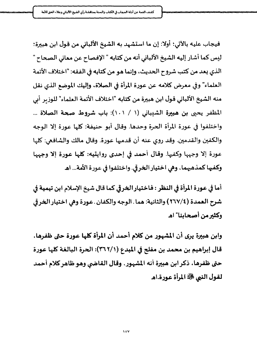 فيجاب عليه بالآتي؛ أولا: إن ما استشهد به الشيخ الألباني من قول ابن هبيرة؛ ليس كما أشار إليه الشيخ الألباني أنه من كتابه " الإفصاح عن معاني الصحاح " الذي يعد من كتب شروح الحديث، وإنما هو من كتابه في الفقه: "اختلاف الأئمة العلماء" وفي معرض كلامه عن عورة المرأة في الصلاة، وإليك الموضع الذي نقل منه الشيخ الألباني قول ابن هبيرة من كتابه "اختلاف الأئمة العلماء" للوزير أبي المظفر يحيى بن هبيرة الشيباني